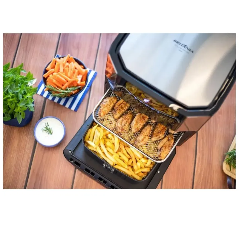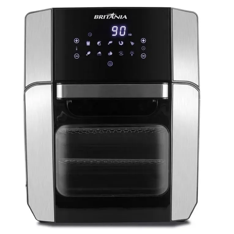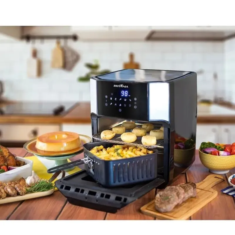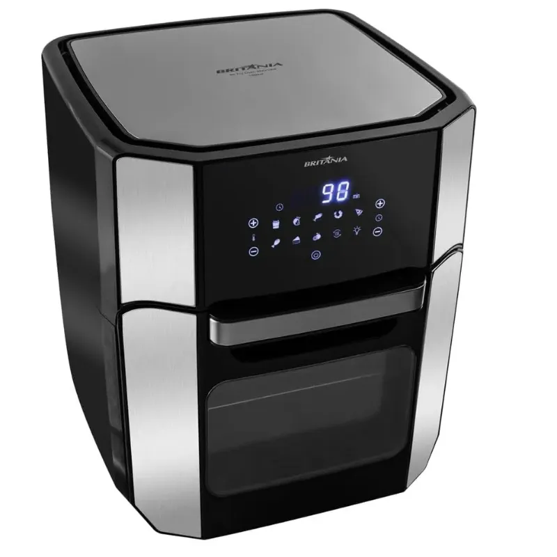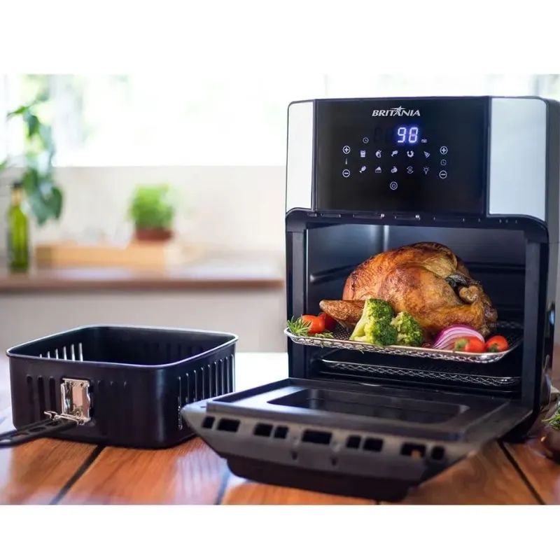 Perfeito para quem está com fome, mas não quer ficar muito tempo na cozinha. Aproveite toda a praticidade que a Fritadeira Air Fry Oven Britânia BFR2100P 4 em 1 12L 1800W pode proporcionar para você no seu dia a dia, com agilidade e as vantagens da tecnologia air fry aliadas à versatilidade do forno. Preparos muito simples e rápidos. A incrível potência de 1800W da Fritadeira Britânia, possibilita o preparo dos mais variados alimentos, tendo o controle e alcance de temperaturas entre 80 e 200 °C. Por ser removível e possuir revestimento antiaderente Dura Mais, ele traz maior resistência, durabilidade e evita que alimentos grudem no cesto. Tamanho ideal para preparar receitas para você, seus amigos e toda a família! Ele possui capacidade total de 12 litros, ideal para preparar receitas maiores. Cesto e assadeira que não grudam e não há necessidade do uso de óleo. O Antiaderente Dura Mais possibilita preparar carnes, legumes, grãos, tudo o que você quiser de forma muito prática.