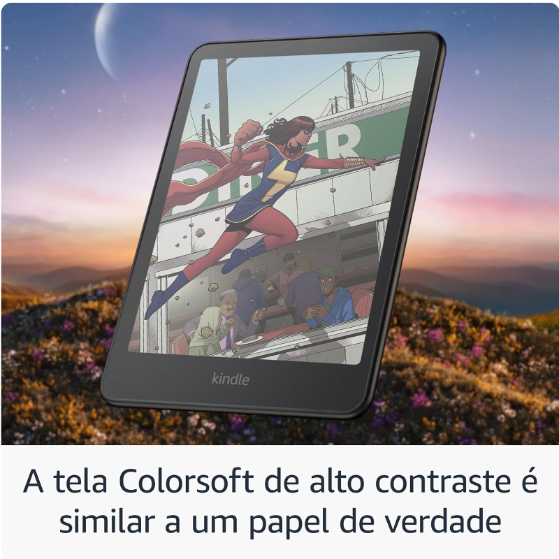 Leia em cores – A nova tela Colorsoft de 7” oferece alto contraste suave aos olhos, com cores semelhantes ao papel que dão vida às capas e ao conteúdo. Destaque suas passagens favoritas em amarelo, laranja, azul e rosa. Maratona literária – Uma única carga por USB-C dura até 8 semanas.Uma experiência inédita – A tela Colorsoft foi projetada para leitura em cores, diferenciando-se da tela Paperwhite. Use o recurso "cor da página" para inverter o texto preto e o fundo branco dos livros ou vice-versa. Apesar de ser diferente do "modo noturno", este recurso oferece uma leitura confortável enquanto mantém a exibição das cores nas imagens e capas.Leia em qualquer iluminação – Ajuste a temperatura de cor de branco para âmbar para poder ler sob o sol ou no escuro.Mergulhe em seus livros – O Kindle não tem acesso a anúncios, redes sociais, notificações ou outros aplicativos que tiram a sua atenção.Pronto para viagens – O design ultra-fino conta com uma tela grande antirreflexo, garantindo páginas sempre nítidas onde você estiver.À prova d’água e de preocupações – Leve suas histórias para a piscina, banheira ou para onde você quiser.Imensa variedade de livros – Obtenha acesso imediato a mais de 3 milhões de títulos na Loja Kindle e assine o Kindle Unlimited para ter acesso a ainda mais conteúdo, incluindo best sellers.