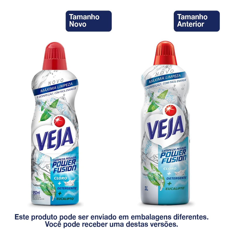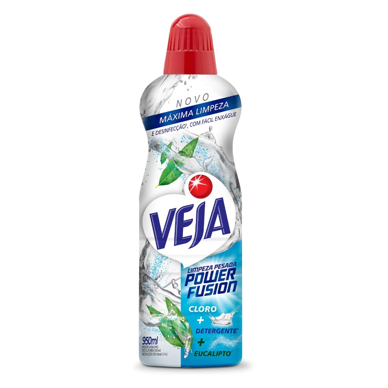Veja Limpeza Pesada Power Fusion¹ com Cloro + Detergente² + Eucalipto³ é o desinfetante4 e limpador e para uso geral com fácil enxague, que oferece máxima limpeza, branqueamento5 e desinfecção4, matando 99,9% das bactérias4 e deixando um agradável cheirinho. Esqueça as misturinhas! Veja Limpeza Pesada Power Fusion Cloro é o produto de limpeza que é recomendado para higienizar azulejos, ladrilhos vitrificados, pisos frios, vasos sanitários, banheiras, tapetes e cortinas plásticas, box de banheiro, toldos e tetos de vinil, paredes com pintura epóxi ou concreto aparente6. É dia de faxina? Veja Limpeza Pesada Power Fusion é a melhor linha de limpadores de piso Veja de todos os tempos7, que deixa os pisos renovados8 e tira o limo entre os pisos com eficiência e rapidez, sem danificar as superfícies e sem esforço. Fácil de usar! Para limpeza do dia a dia, dilua 2 ¾ tampas (80ml) do produto em 5L de água, aplique nas superfícies a serem limpas e enxague. Para limpeza pesada dilua 2 tampas (60ml) do produto em 1L de água, aplique nas superfícies a serem limpas e enxague. Para eliminar bactérias na desinfecção doméstica, plique o produto puro e deixe agir por 10min antes de enxaguar. Para limpeza de limo incrustado entre os azulejos e pisos cerâmicos, aplique o produto puro com a ajuda de uma esponja, deixe agir por 10min e, em seguida, enxague bem. Veja Limpeza Pesada Power Fusion Eucalipto com Cloro deixa a sensação de casa limpa. Sua casa impecável Se para você limpar a casa é uma tarefa desafiadora, Veja Limpeza Pesada Power Fusion traz superioridade7 e praticidade na rotina de limpeza da sua casa. Ele é o limpador de pisos Veja com máxima performance, que deixa as superfícies brilhantes9 e profundamente higienizadas, sem precisar ficar horas esfregando. Desfrute com sua família de um ambiente limpo, fresco e convidativo que Veja Limpeza Pesada Power Fusion faz o trabalho pesado por você. Qualidade e vanguarda Desde 1969, Veja coloca o poder da limpeza nas mãos dos consumidores, oferecendo soluções avançadas para todos os cômodos da casa. Veja é líder na categoria de Limpadores de Superfícies10 e está presente em 55% dos lares brasileiros11, proporcionando praticidade e eficácia na rotina de limpeza. Experimente as duas versões de Veja Limpeza Pesada Power Fusion: Cloro + Detergente² + Eucalipto³ e Bicarbonato de Sódio + Álcool + Limão12. ¹ Leia atentamente o rótulo antes de usar. ² Ação detergente. ³ Contém óleo essencial de eucalipto. 4 Bactérias testadas: Staphyloccocus aureus E Salmonella choleraesuis. 5 Branqueamento proporcionado pela ação do cloro, com efeito residual por 5 dias, formando camada protetora contra crescimento do fungo Aspergillus brasiliensis. 6 Teste em uma pequena área antes de usar. 7 Comparado com produtos da categoria de limpeza do fabricante. 8 O processo de limpeza removerá a sujeira da superfície, podendo restaurar o piso, deixando-o como novo. 9 Brilho provenientes da limpeza do piso. 10 Base de Mercado Nielsen, 2023. 11 Kantar MAT Set’24. 12 Extrato de limão.