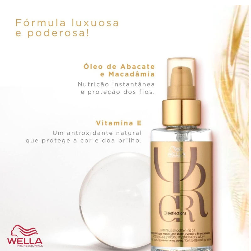 Óleo para todos os tipos de cabelos. Versátil, Wella Professionals Oil Reflections Luminous Smoothening Óleo Capilar protege, nutre e deixa o cabelo macio e com efeito gloss. É mais nutritivo, sendo indicado para cabelos que precisam de uma carga maior de nutrientes. Wella Professionals Oil Reflections Luminous Óleo Capilar pode ser usado como pré-shampoo, tratamento noturno, leave-in, proteção térmica contra secador e extra brilho. Protege durante processos químicos, além de proteger a cor do cabelo.