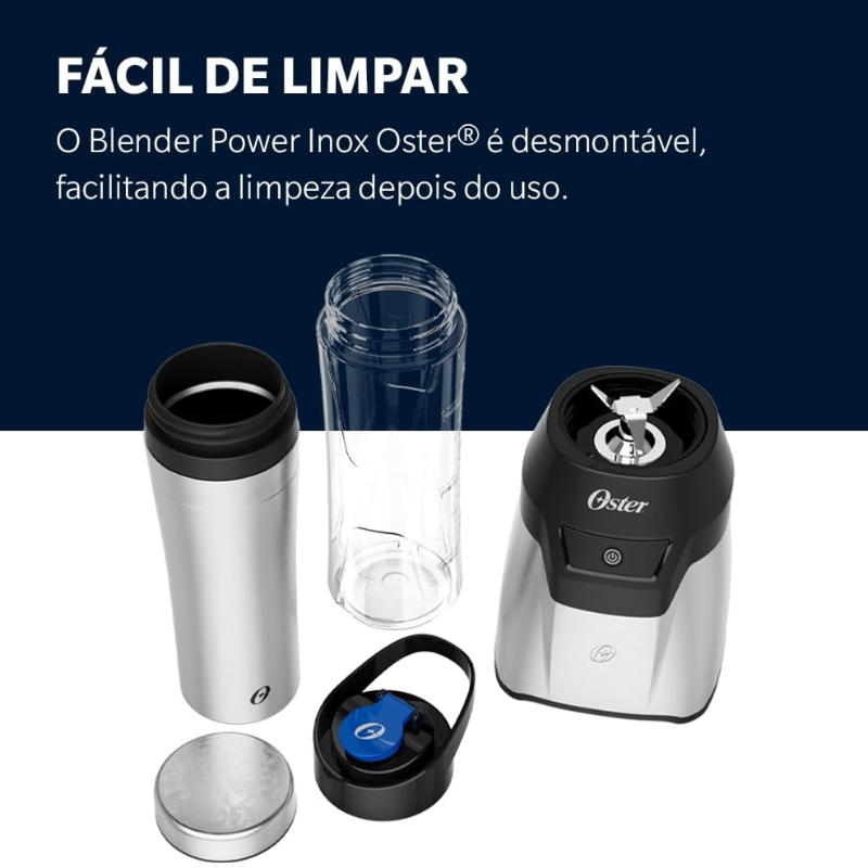 Na sua vida dinâmica, não podem faltar as receitas saudáveis preparadas pelo Blender Inox Oster. Ele traz 2 opções de jarras TO GO para você otimizar seu tempo e levar mais sabor para onde for: um copo grande e super resistente em tritan e outro em inox que mantém a bebida fresca por mais tempo. - 2 Jarras To Go: A Versatilidade que você Precisa: Leve sua bebida para onde quiser! A jarra de tritan de 600ml é resistente e muito leve, e a outra em inox de 475ml mantém a bebida fresca por mais tempo. Experimente como é fácil e rápido preparar bebidas como sucos, vitaminas, shakes e muito mais. - Alto Desempenho para Facilitar sua Vida: Com 4 lâminas em aço inox, tritura com eficiência frutas, vegetais e até gelo, oferecendo alta performance para as receitas. E o botão ON/OFF oferece praticidade, garantindo que suas bebidas fiquem no ponto certo. - Prático e Fácil de Limpar: Simples de usar, permitindo levar suas bebidas com você, e prático de preparar e limpar, usando apenas um copo. É desmontável para facilitar ainda mais a limpeza. - Design Inovador: e resistente: Corpo em inox que confere estilo e durabilidade, além de oferecer a máxima eficiência no preparo de suas bebidas. - Potência que Garante o Sabor: O seu Blender Inox Oster tem 700W de potência, proporcionando preparar com mais rapidez e eficiência as mais deliciosas receitas de bebidas. - Selo de Segurança OCP SGS