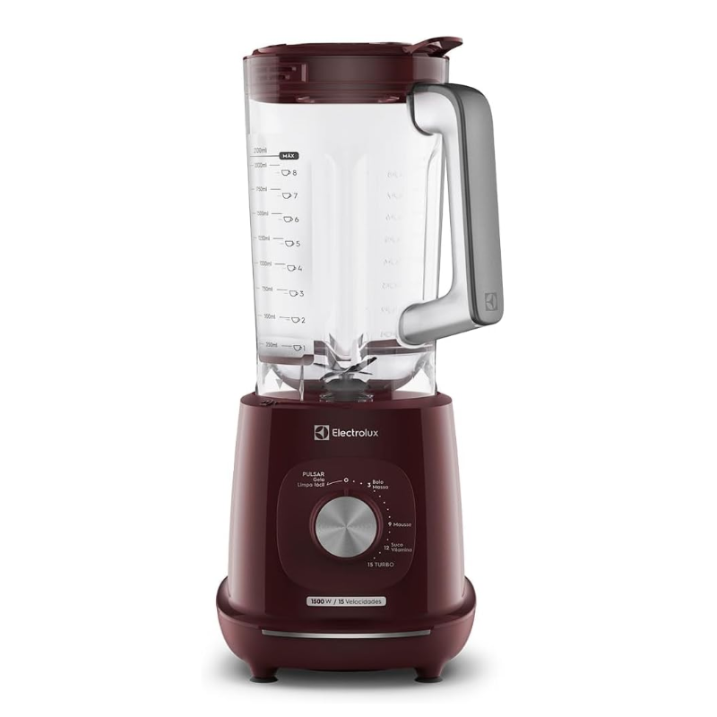 Descrição curta: Com o Liquidificador Electrolux 1500W 3,2L Efficient com Tri Force 15 Velocidades Vermelho (EBL1510), você tem mais agilidade nos preparos, eficiência em cada etapa e resultados consistentes para facilitar sua rotina na cozinha. ------ Prepare-se para revolucionar sua cozinha com o Liquidificador Electrolux 1500W 3,2L Efficient com Tri Force 15 Velocidades Vermelho (EBL1510). Com a Tecnologia TriForce – que une lâminas resistentes à potência eficiente e alta velocidade –, este liquidificador oferece um desempenho avançado para o dia a dia. Capaz de triturar gelo até 4x1 mais rápido e aumentar o aproveitamento de alimentos em até 10x2, ele ajuda você a minimizar o desperdício. Mais agilidade nos preparos, eficiência em cada etapa e resultados consistentes para facilitar sua rotina na cozinha. A Função Pulsar 3 em 1 pode ser usada para receitas pesadas e preparos rápidos, triturar gelo ou tornar a limpeza do seu liquidificador muito mais prática. Ela ajuda a remover os restos dos alimentos até 2x³ mais rápido e economiza água no processo. São até 547 litros4 poupados por ano em comparação com a limpeza manual – o equivalente a 110 galões de água (5 L cada). Mais economia para você e uma escolha mais sustentável para o planeta. O Liquidificador Electrolux 1500W Efficient com TriForce (EBL1510) tem ainda 6 lâminas TruFlow, que são feitas de aço inoxidável e combinam resistência com precisão para entregar cortes mais eficientes. As lâminas laterais atingem os alimentos nas bordas da jarra, enquanto as intermediárias ajudam a triturar até mesmo os alimentos mais pesados. As superiores finalizam com cortes finos e uniformes. O produto funciona em 15 velocidades e vem com 5 receitas predefinidas para maior precisão no preparo de bolos, massas, sucos e vitaminas. É equipado com uma jarra de plástico ultrarresistente, livre de Bisfenol A, com design ergonômico e uma generosa capacidade total de 3,2 litros. Disclaimers Copiar ¹ Resultados obtidos em testes internos ao avaliar o tempo necessário para triturar 100 g de gelo em cubos grandes ao comparar o modelo EBL1500/EBL1510 com modelos anteriores da linha Electrolux. ² Resultados obtidos em testes internos ao avaliar o peso de resíduos deixados de diversos tipos de alimentos triturados em velocidade máxima por 10 segundos, ao comparar o modelo EBL1500/EBL1510 com modelos anteriores da linha Electrolux. Alimentos usados: limão 3 unidades, uva 500 g, cenoura 300 g, carne em cubos 300 g. ³ Resultados obtidos em testes internos ao avaliar o tempo necessário de limpeza total da jarra usando a função Pulsar continuamente, ao comparar o modelo EBL1500/EBL1510 com modelos anteriores da linha Electrolux. ⁴ Resultados obtidos em testes internos ao calcular a quantidade de água usada em litros por minuto para realizar a limpeza da jarra de maneira convencional e manual versus a limpeza com a função Pulsar do modelo EBL1500/EBL1510. Sob as seguintes condições: se a jarra for limpa sob a torneira a uma taxa de 3,6 L/min por 1 minuto, o usuário usaria 3,6 litros de água para limpar a jarra. Se a função Pulsar for usada, apenas a capacidade máxima do produto é usada.