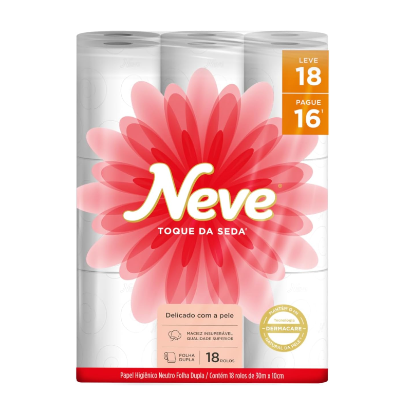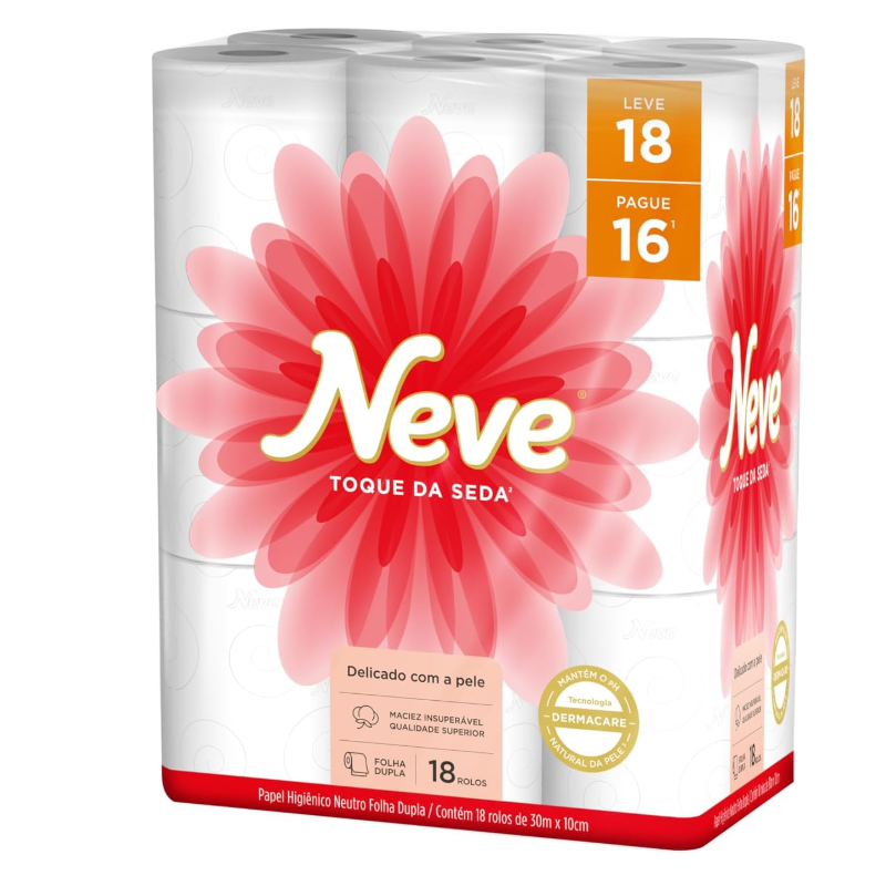Neve Papel Higiênico Toque de Seda Folha Dupla, 30m, Leve 18 Pague 16 Rolos