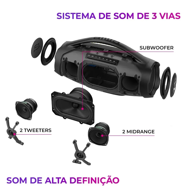 Reunir nossa família e amigos e desfrutar de uma boa música é um dos prazeres da vida, né? Curta um som potente e de alta definição com a Boombox AIWA AWS-BBS-01B! A caixa de som portátil foi projetada com sistema de som de 3 vias - 1 subwoofer, 2 midrange e 2 tweeters -, além de ter dois radiadores passivos laterais, 200W RMS de potência e o DNA japonês da marca AIWA. Com o certificado IP66, você e sua turma podem ouvir sua playlist favorita na beira da piscina ou na praia sem preocupação, já que a Boombox é resistente a jatos potentes de água e tem proteção total contra poeira. Incrível, né? Saiba mais sobre a AWS -BBS-01B: