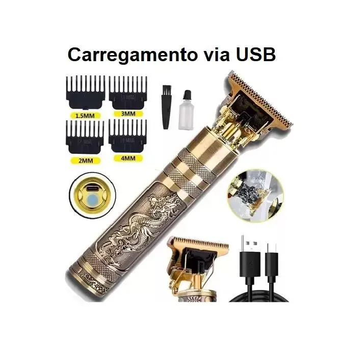 Máquina Dragão ou Buda Dourado Profissional Para Barba E Cabelo Esta máquina é usada nas barbearias mais famosas dos eua, não, somente, por conta do seu design moderno e luxuoso. A máquina buda é extremamente confortável e delicada, A lâmina em T permite que você faça a barba ou raspe o cabelo livremente em qualquer direção. Especificações/Características do Produto: - Modelo: Máquina Buda Profissional - Material: Metal - Cor: Dourado - Lâminas de Titanium - Bateria: 18,500 Lithium-ion Itens Inclusos: - 1 Aparador de cabelo - 4 Pentes( 1,5mm,2mm, 3mm,4mm - 1 cabo usb - 1 Escova - 1 Óleo para máquina .