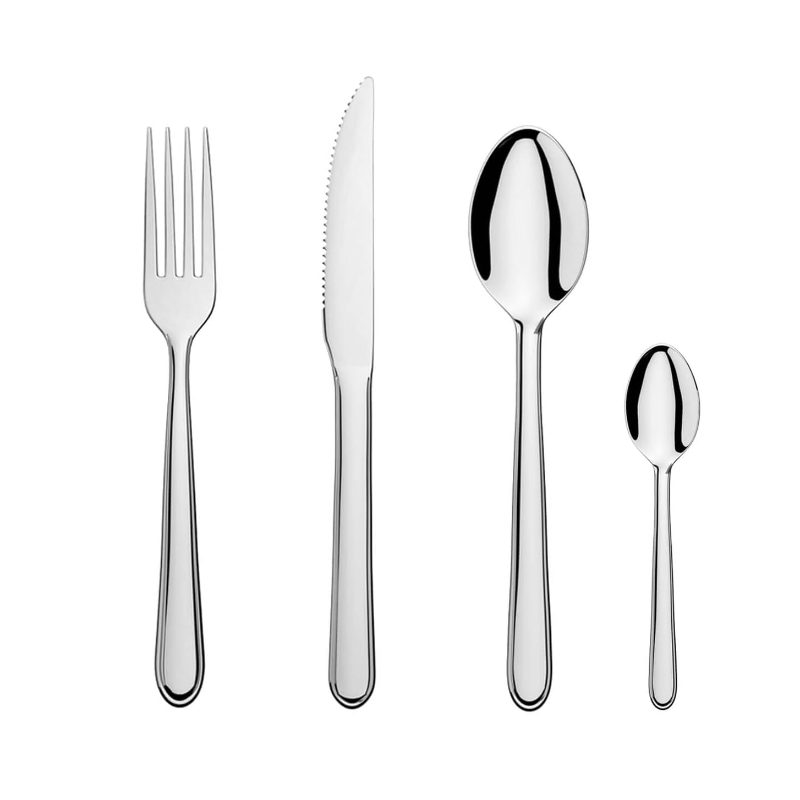 Práticos e resistentes, os talheres da linha Turim são ideais para o dia-a-dia. Os utensílios são feitos de aço inox com acabamento polido, e os cabos apresentam um friso que é marca da linha. Este faqueiro de 42 peças contém talheres para servir uma refeição para seis pessoas: colheres e garfos de mesa, facas de churrasco, colheres e garfos de sobremesa, colheres de chá e de café. Todos os produtos podem IR à lava-louças.