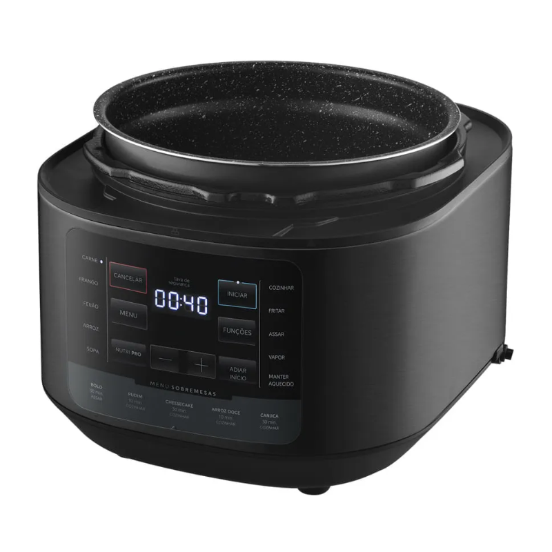 A Panela de Pressão Elétrica 5L Nutri-pro Preta Midea oferece praticidade e agilidade no preparo das suas receitas. Sua função Nutri-pro regula o vapor automaticamente, preservando os nutrientes e auxiliando na liberação de sabores, enquanto a função Vapor é ideal para preparar receitas saudáveis. A função Manter Aquecido mantém a refeição na temperatura perfeita após o preparo, e o revestimento antiaderente Blackstone impede que a comida grude, facilitando a limpeza. Além disso, os 9 dispositivos de segurança e o desligamento automático permitem que você cozinhe com tranquilidade.