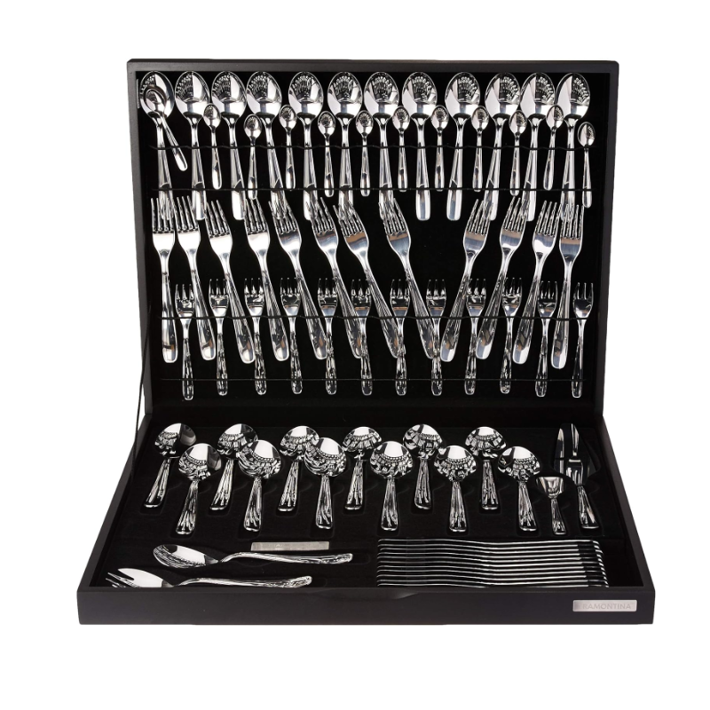 As peças são acondicionadas em um belo estojo de madeira mdf. Totalmente feitas de aço inox, altamente duráveis, mantêm suas características originais, preservando a beleza, a higiene e a durabilidade do material. Colheres com bojo em formato simétrico e bordas cuidadosamente arredondadas. Garfos com dentes polidos na parte interna, com formato apropriado para a boca e bordas arredondadas para proporcionar maior conforto no uso. Facas totalmente temperadas, que garantem maior durabilidade no fio de corte e maior resistência à corrosão, e por suas características de temperabilidade, não riscam as porcelanas. Acabamento em brilho. Serviço para mesa e sobremesa. Podem ser lavadas diariamente na máquina de lavar louças.