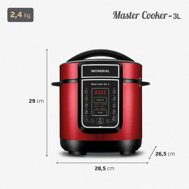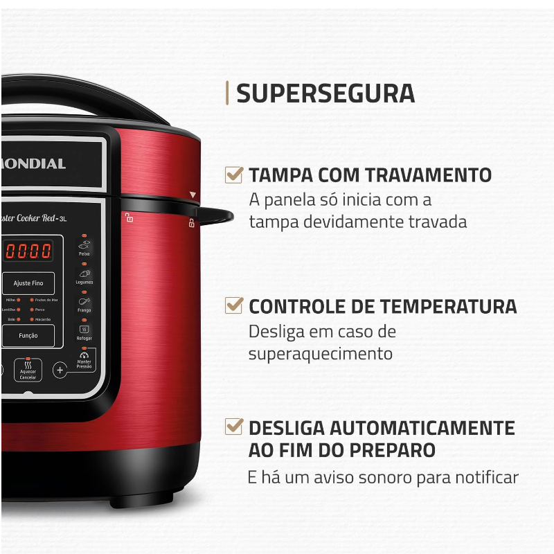 A Panela de Pressão Elétrica Digital Master Cooker Red 3L Mondial vai trazer muito mais praticidade dentro da cozinha. Possui painel digital com 14 receitas predefinidas, que inicia os preparos com apenas um clique! Você também tem a opção de programar o cozimento automático com até 24 horas de antecedência. Com capacidade de 3 litros, é ideal para o preparo de deliciosas receitas. Saiba mais sobre a PE-41 da Mondial:
