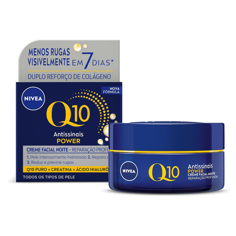 O que é? Creme facial que reduz rugas profundamente. Sua fórmula exclusiva reduz linhas de expressão e deixa a pele com aparência mais jovem em apenas 4 semanas de uso. Confira +detalhes! Para que serve o NIVEA Q10 Power Plus Noite? Composto com Q10+MaxCreatina, dois componentes que agem diretamente nas rugas, melhorando a firmeza em 2 semanas. Use à noite para a pele absorver mais nutrientes. Benefícios e diferenciais - Hidratação por 24h - Revitaliza a pele durante a noite - Adequado para peles sensíveis - Dermatologicamente testado Como usar o NIVEA Q10 Power Plus Noite? Com a pele limpa e seca, aplique no rosto e massageie suavemente até a absorção completa do produto. Uma unidade de embalagem contém 50ml