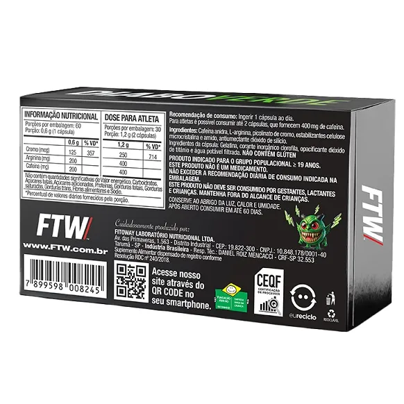O que é / Para que serve O Diabo Verde #ThermoCaps FTW é um suplemento alimentar em cápsulas à base de cafeína, L-arginina e picolinato de cromo, desenvolvido para ser consumido por adultos como parte de uma rotina alimentar equilibrada. Ingredientes Cafeína anidra, L-arginina, picolinato de cromo, estabilizante (celulose microcristalina e amidextrina) e dióxido de silício. Composição da Cápsula: Gelatina, corante inorgânico azul brilhante FCF, opacificante dióxido de titânio e água potável filtrada. NÃO CONTÉM GLÚTEN.