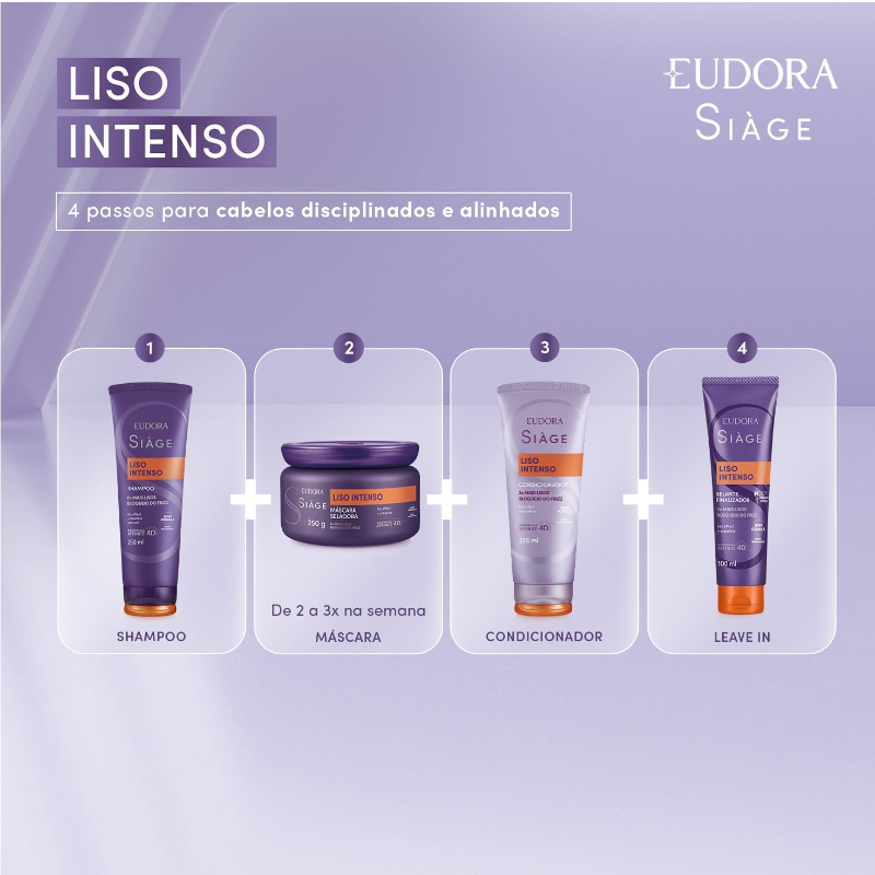 Eudora Siàge Liso Intenso possui fórmula inteligente que se adequa a lisos naturais, alisados ou com ondas indesejadas, proporcionando liso perfeito por muito mais tempo. A proteína Creatina, aliada ao complexo Liss Effect, bloqueia os agentes causadores do frizz e de fios indisciplinados, deixando os cabelos hidratados, macios e com muito brilho. Protege do calor do secador e chapinha por até 230º. Alisados - Aparência de lisos naturais - Liso prolongado sem química - Reduz porosidade dos fios - Pontas hidratadas sem aspecto alisado Lisos com Ondas - Suaviza ondulações indesejadas - 2x menos volume Lisos Naturais - Frizz controlado - Hidrata sem pesar