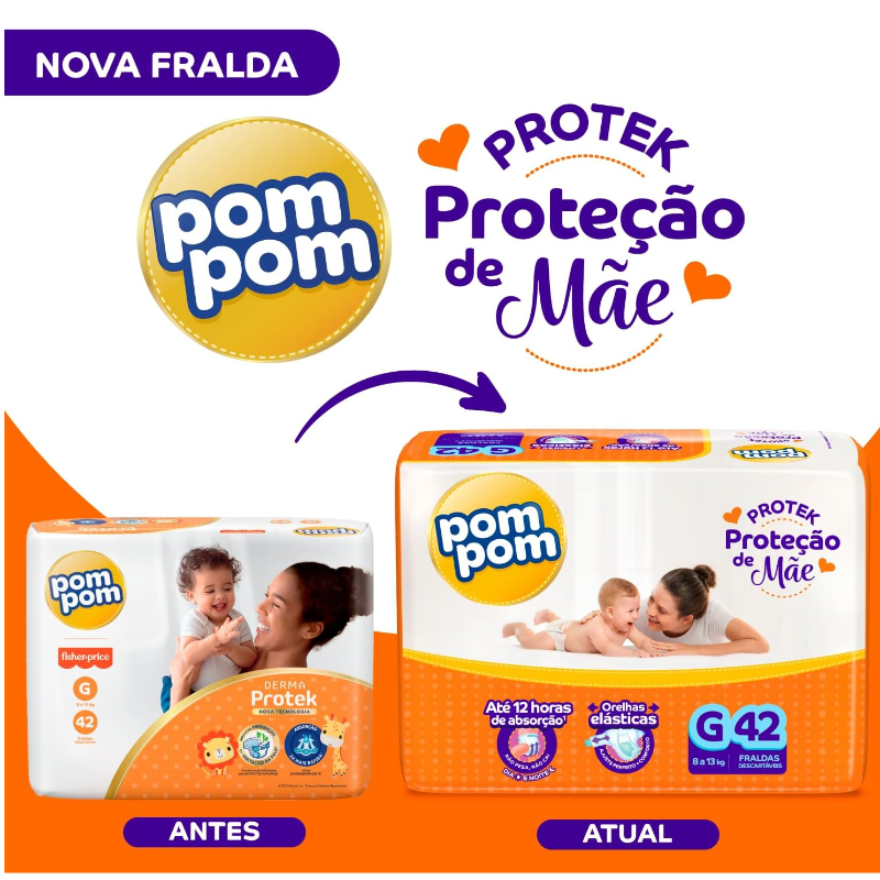 Pom Pom Protek Proteção de Mãe é a proteção que cuida do seu bebê por até 12 horas, garantindo dias e noites tranquilas, com orelhas elásticas que garantem mais conforto e um ajuste perfeito na cinturinha do bebê, e canal superabsorvente que distribui o xixi mais rápido, evitando que a fralda pese e caia entre as perninhas do bebê.