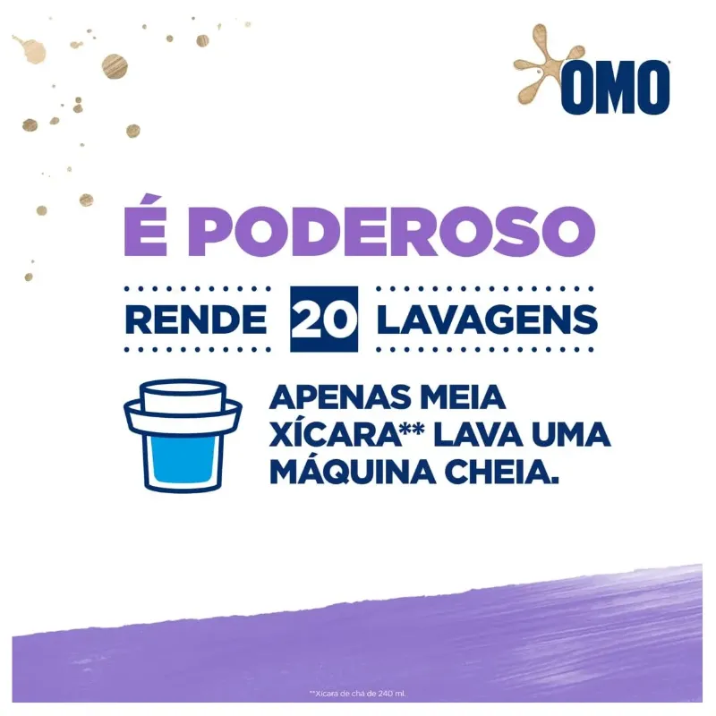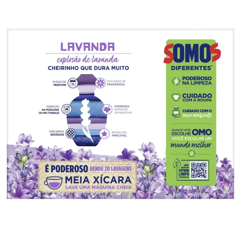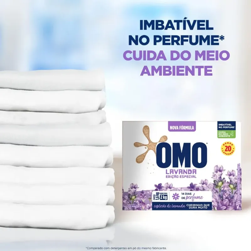 O lava roupas OMO Lavagem Perfeita com Perfume de Lavanda é perfeito para um momento de tranquilidade e de relaxamento. OMO Lavagem Perfeita com Perfume de Lavanda possui em sua fórmula um perfume exclusivo de lavanda que dura 14 dias. Seu pó ultrafino possui rápida dissolução, não deixando resíduos que danificam as roupas durante as lavagens, remove manchas de primeira, higieniza as roupas, brancura imbatível, elimina o mau odor, e isso tudo cuidando das cores e dos tecidos. Além de todo esse poder e cuidado com as suas roupas, OMO Lavagem Perfeita com perfume de Lavanda se preocupa com o meio ambiente. Sua fórmula contém ingredientes biodegradáveis e não possui fosfato, ajudando a preservar rios e oceanos, e economiza água, pois precisa de apenas 1 enxágue¹. OMO Lavagem Perfeita com Perfume de Lavanda foi totalmente reformulado e está mais poderoso, é necessário apenas meia xícara (240mL) para lavar uma máquina cheia. Seu uso é recomendado por Brastemp e Consul. Para saber mais sobre a linha de produtos OMO, OMO Tira Manchas e OMO Desinfetantes, acesse o site. Mantenha o produto fora do alcance de crianças e dos animais domésticos. Leia o rótulo antes de usar o produto. ¹Reduzindo de 2 ou mais enxágues para apenas 1.