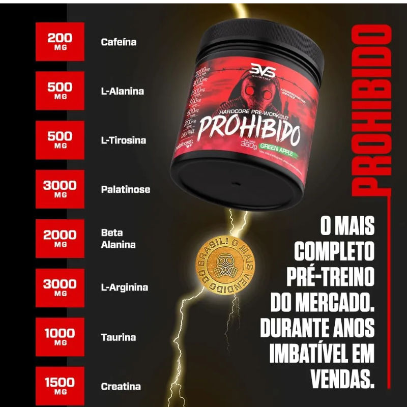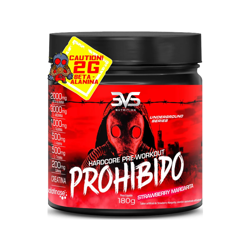 Seus Treinos Mais Insanos e Intensos - Prepare-se para um Novo Nível - Energia e Disposição para Você Atingir o Shape dos Seus Sonhos! Prohibido 3VS Nutrition é o fim da energia baixa e falta de motivação para os treinos. Com ele você terá mais energia, para enfrentar os treinos - com intensidade total - no início, meio e fim, graças a tecnologia de liberação gradual de energia. Prohibido também vai libertar sua fera interior, permitindo uma maior explosão de força em seus músculos e uma vasodilatação maior, fazendo com que você aguente mais cargas. A queima de gordura é acentuada pela facilitação na transformação desta em energia, que vai se tornar combustível para turbinar ainda mais os seus treinos. Prohibido faz tudo isso enquanto te traz aquele foco e concentração, necessários para os treinos que realmente vão trazer diferença no seu shape. Além disso, ele tem propriedades que protegem seu sistema circulatório e coração e trazem bem-estar ao seu dia a dia.