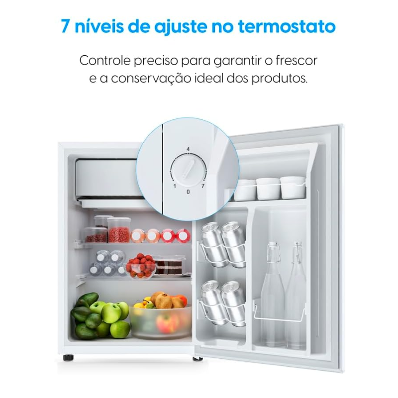 Compacto, funcional e eficiente, o Frigobar Elgin é a escolha ideal para casas, escritórios, áreas de lazer e hotéis! Com capacidade de 70L e disponível nas versões 110V e 220V, conta com porta reversível 180°, permitindo adaptação ao espaço disponível. Seu termostato com 7 níveis de ajuste proporciona controle preciso da temperatura, garantindo a conservação ideal de alimentos e bebidas. Este modelo possui prateleiras de vidro removíveis para facilitar a organização e limpeza. Além disso, possui um compartimento extra de frio para resfriamento de produtos sensíveis, como frios e laticínios, e um compartimento exclusivo para latas. Econômico e sustentável, o Frigobar Elgin possui classificação energética A pelo INMETRO, garantindo baixo consumo de energia, e utiliza o gás ecológico R600A, que melhora o desempenho da refrigeração e reduz o impacto ambiental. Seja para manter suas bebidas sempre geladas, armazenar lanches ou facilitar o dia a dia, o Frigobar Elgin é a solução perfeita! Elgin – Mais do que você imagina