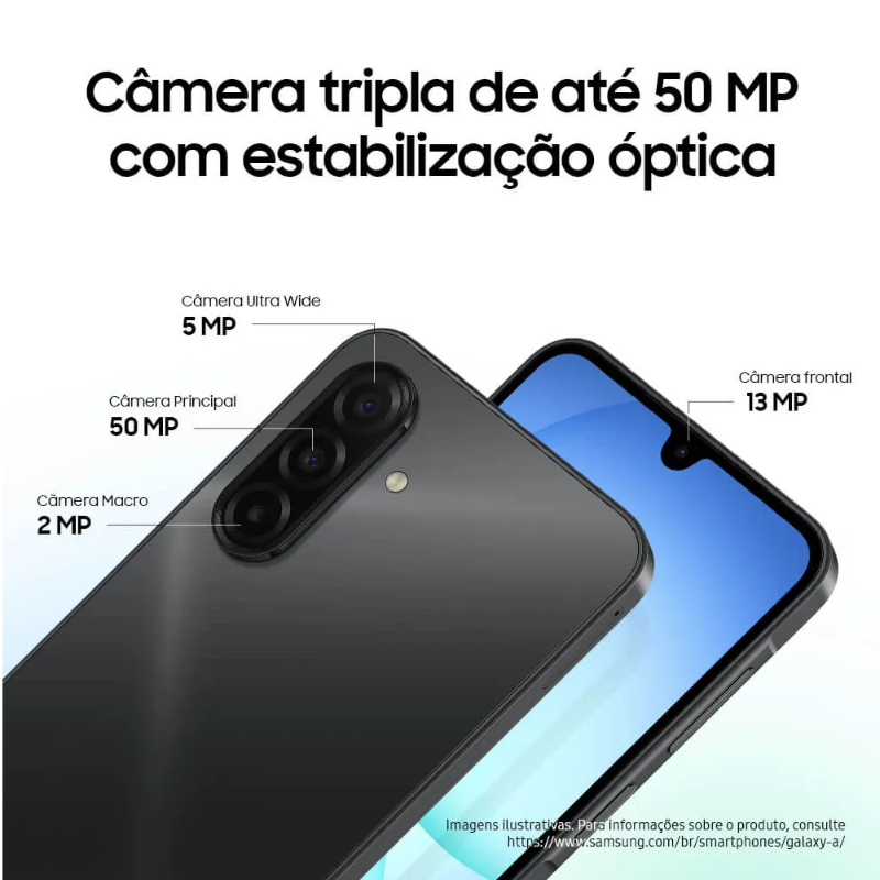 Celular Samsung Galaxy A17, com IA integrada, 128GB, 4GB RAM, 4GB RAM Plus, Câmera Tripla Traseira de até 50MP, Câmera Frontal de 13 MP,Tela resistente Super AMOLED de 6.7", Processador Helio G99 Octa-Core de 6nm, Android 15 com 6 atualizações, IP54 resistencia à água e poeira, NFC, Samsung Wallet, Bateria de 5.000mAh, Dual Chip. O Galaxy A17 chegou para transformar a maneira como você se conecta, tendo tudo para ser seu primeiro Galaxy com IA. Com ele, você vai registrar cada momento com uma câmera tripla de até 50MP. Sua telona de 6,7" de Super AMOLED tem mais resistência. Feito para durar, modelo traz design moderno, acabamento premium, até 6 atualizações de Android e até seis anos de atualizações de segurança, proteção IP54 contra água e poeira, unindo estilo, funcionalidade e resistência em um só aparelho. Como novidade o novo Galaxy A17 possui Gemini integrado e o Circule para Pesquisar, ferramentas de IA do Google. O Gemini integrado enriquece seu dia a dia com um assistente de IA que é fácil de usar, que entende o que você diz de maneira natural. Com um simples toque no botão lateral você acessa o Gemini rapidamente. Com a ação integrada entra aplicativos, o Gemini integra não somente aplicativos Google, mas também aos aplicativos nativos do Galaxy e de terceiros para oferecer assistência inteligente em toda a experiência do seu dispositivo. Usando o Circule para Pesquisar, você pode intuitivamente pesquisar qualquer coisa na tela, como imagens, músicas ou texto. Encontre respostas e ações necessárias rapidamente. Na pesquisa de imagens, basta circular um item ou objeto para visualizar informações adicionais sobre ele. Quer saber mais sobre uma música? Toque, cante ou cantarole para encontrar mais informações sobre ela. E com os pins de ação faça chamadas, envie e-mails ou visite um site com apenas um toque na tela. A câmera tripla de 50MP com estabilização óptica (OIS) permite que você capture cada detalhe de diferentes ângulos para fotos e vídeos criativos mesmo em movimento. Leve suas memórias para o próximo nível. A telona Super AMOLED de 6,7” FHD+ te entrega cores mais vivas, contraste profundo e brilho otimizado para qualquer ambiente, seja assistindo filmes, jogando ou navegando nas redes sociais. Fique despreocupado, o Gorilla Glass Victus te entrega durabilidade superior contra riscos e quedas. Feito para durar e atualizado por mais tempo, o Galaxy A17 oferece uma experiência duradoura e segura, assegurando até 6 atualizações de sistema operacional Android e até 6 anos de atualizações de segurança. Além disso, conta com proteção IP54, garantindo resistência à água e poeira. Sua segurança é aprimorada através do Samsung Knox Vault, garantindo que dados confidenciais e sigilosos, como senhas e pins de desbloqueio, permaneçam seguros. O seu acabamento sofisticado e fino, com espessura de 7,5mm e apenas 190g traz conforto e ergonomia. Com o aplicativo SmartSwitch você transfere de forma fácil e prática o conteúdo do seu celular anterior (fotos, contatos, eventos do calendário, notas, configurações do dispositivo e muito mais). O Galaxy A17 é mais do que um smartphone é seu novo parceiro para trabalhar, se divertir e se conectar, combinando tecnologia de ponta com a confiabilidade da Samsung.