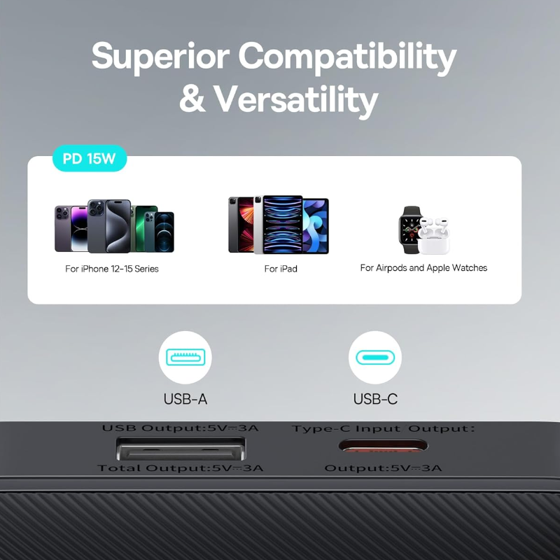 Portas diversas: com porta de carregamento USB e porta Tipo C, pode carregar uma variedade de dispositivos.
