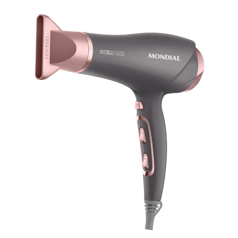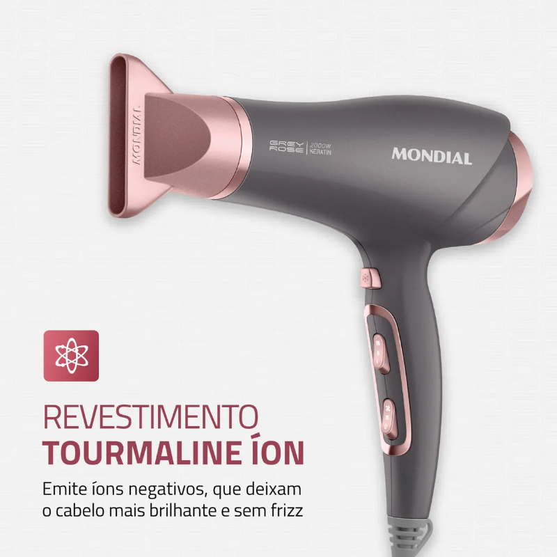 O secador de cabelo Grey Rose Keratin SCN-11 da Mondial tem um design moderno e protege seus fios durante a secagem. Incrível, né? Isso porque ele possui o Keratin Technology, a tecnologia com queratina que garante uma secagem saudável, realça o brilho e reduz o frizz. Além disso, ele também tem revestimento com Tourmaline Íon e sela a cutícula dos fios, deixando-os mais disciplinados e macios. Saiba mais sobre o SCN-11 da Mondial: KERATIN TECHNOLOGY O revestimento cerâmico com queratina promove maior proteção aos fios durante a secagem. A tecnologia garante uma secagem saudável, realça o brilho e reduz o frizz. REVESTIMENTO COM TOURMALINE ÍON Libera íons negativos, que selam as cutículas dos fios, deixando-os disciplinados, macios e com brilho intenso. POTÊNCIA: 2.000W Alta potência para uma secagem rápida e eficiente. 3 TEMPERATURAS + 2 VELOCIDADES Alterne entre as variações de velocidade e temperatura para uma secagem mais adequada aos diferentes tipos de cabelo. JATO DE AR FRIO O choque de temperatura no final da secagem reduz o frizz e ajuda a fixar a modelagem. BOCAL DIRECIONADOR Concentra e direciona o fluxo de ar, proporcionando mais precisão e facilidade para modelar os fios. GRADE TRASEIRA REMOVÍVEL Facilita a limpeza e aumenta a vida útil do secador de cabelo. CABO DE 1,8 METROS O cabo-plugue tem 1,8 metros de comprimento, garantindo mais autonomia de movimento. A Mondial é a escolha de milhões de consumidores. Mondial, a escolha inteligente!"