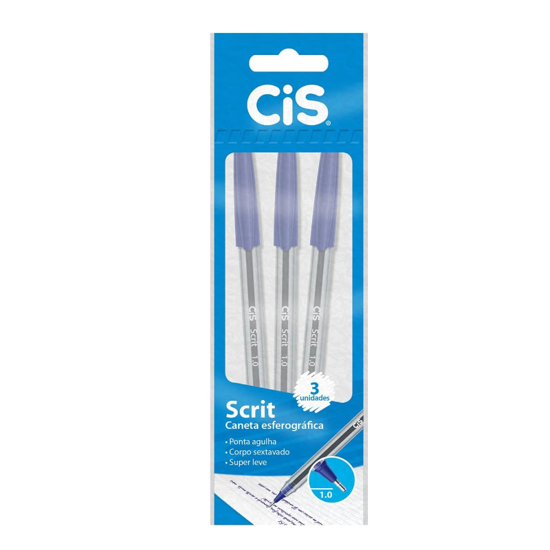 Caneta Esferográfica Cis Scrit 1 mm azul blister com 3 unidades. A Caneta Esferográfica Scrit Cis possui corpo sextavado e ponta agulha metálica. Caneta leve e macia, tornando fácil seu manuseio.