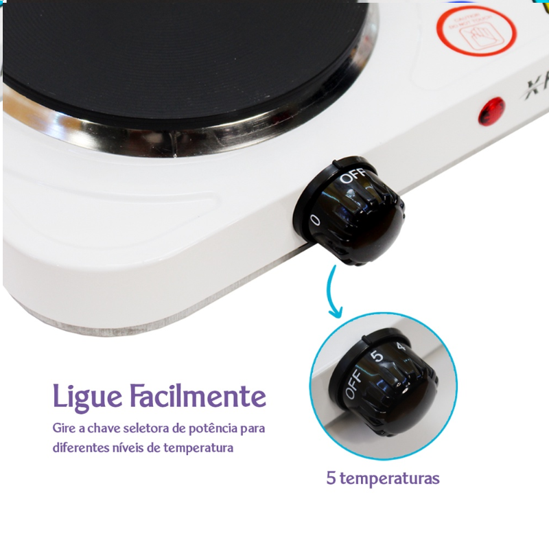 Fogão Elétrico Portátil Cooktop da XFIRE foi desenvolvido para você que precisa cozinhar ou preparar algo, mas não tem espaço ou acesso à um fogão. Super simples de ser usado, basta estar conectado à uma fonte de energia que suas 5 temperaturas fazem o restante do trabalho. Possui 2 placas de aquecimento e termostato com 5 níveis de temperatura que vão de 80º a 400º graus.