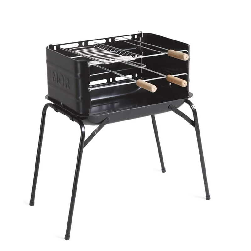 A churrasqueira vem acompanhada de 1 grelha simples, 2 espetos simples e 1 duplo