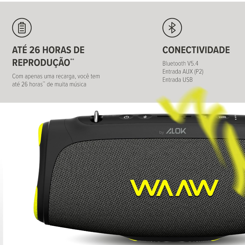 Da piscina ao churrasco, a alça prática no estilo WAAW TO GO deixa a trilha sonora pronta para qualquer rolê. A entrada auxiliar P2 permite conectar facilmente dispositivo com fio de forma simples. Mais eficiente, a caixa de som possui Bluetooth 5.4 para reprodução contínua, sem pausa.