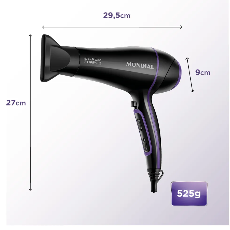 Cabelo seco de forma super-rápida: check! Os 2.000W de potência do Black Purple SCN-01 garantem um excelente desempenho para secagem ágil e eficiente. Além disso, a tecnologia Tourmaline Íon proporciona um aspecto mais saudável aos fios, reduzindo o frizz. Saiba mais sobre o Secador de cabelo Mondial: