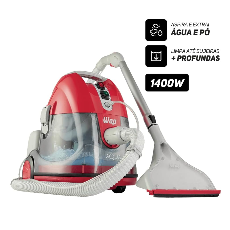 A Extratora de Sujeira WAP Aqua Cleaner vai revolucionar a limpeza da sua casa. Além de fazer uma limpeza completa, possui um inovador sistema de filtragem eco friendly que filtra as impurezas com água, retém melhor a sujeira e aprisiona as partículas para evitar que elas retornem ao ar. Esse sistema faz toda a diferença para quem sofre com alergias como rinite, sinusite e asma. Com 1400W de potência, conta com uma variedade de acessórios, como o bocal múltiplo com escova para aspiração de sólidos, bocal canto, bocal escova, além do bocal extrator grande com rodo removível e bocal extrator pequeno. Dessa forma, é ideal para vários tipos de limpeza, tanto as pontuais como as mais pesadas. É um produto com conexões simples e de fácil encaixe. A mangueira ultrarresistente de 2,3m e com sistema antitorção, possui controle de sucção e gatilho spray integrados. Conta também com uma extensão telescópica (51,5cm fechada e 81,5cm estendida), facilitando o alcance e a mobilidade durante a limpeza. Além de extrair até 4cm* de impurezas em estofados, é um aspirador de água e pó, que pode ser usado para remoção de sujeiras sólidas e líquidas de várias superfícies. Dispõe de recipiente externo removível para água limpa e recipiente interno para água suja. A Extratora de água e pó WAP Aqua Cleaner conta com tripla filtragem. Isso significa que o produto acompanha filtro espuma do motor, filtro espuma da saída de ar e a nova filtragem com água, que impede que partículas menores de sujeira saiam pelos filtros, devolvendo um ar mais puro ao ambiente. Para trazer mais praticidade durante o uso, possui rodas e alça de transporte, além de cabo elétrico retrátil de 5 metros, que pode ser fixado no próprio produto durante o uso. Também contém dispositivo interno de segurança para controle de sucção de líquidos e botões de acionamento de sucção e borrifar independentes, trazendo autonomia e controle de funções na limpeza. A função sopro vem para trazer uma utilidade a mais, auxiliando na secagem de tecidos e estofados, e ainda sendo indicado para soprar folhas, cantos de difícil acesso, encher infláveis e acender churrasqueiras. A Extratora de Sujeiras WAP Aqua Cleaner é mais uma solução WAP para higienizar, extrair sujeiras, renovar móveis e recuperar o aspecto de novo de tudo na sua casa e é uma exclusividade POLISHOP. *Varia de acordo com a densidade do estofado/colchão."
