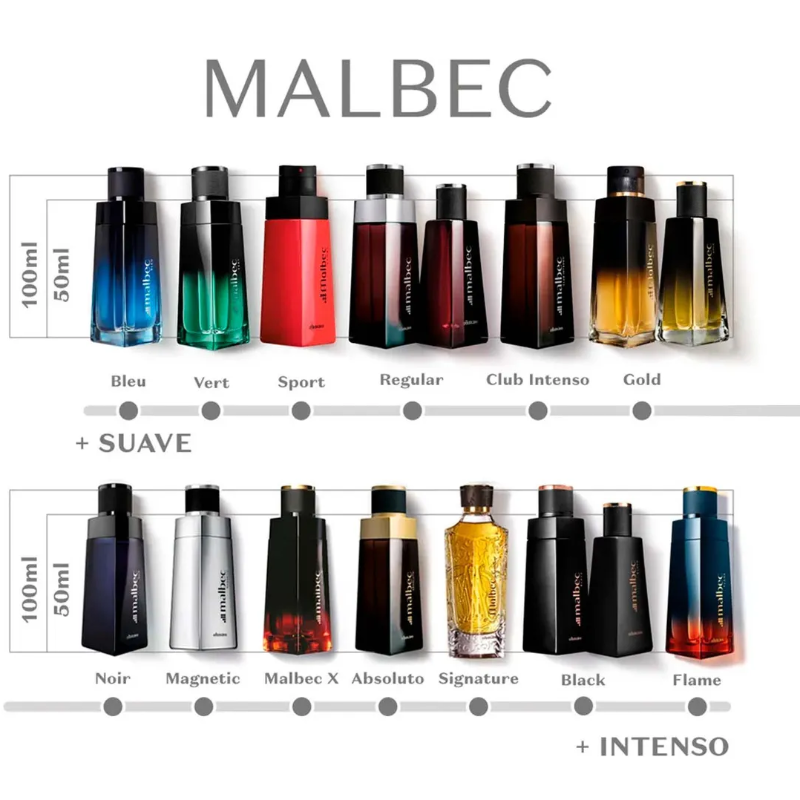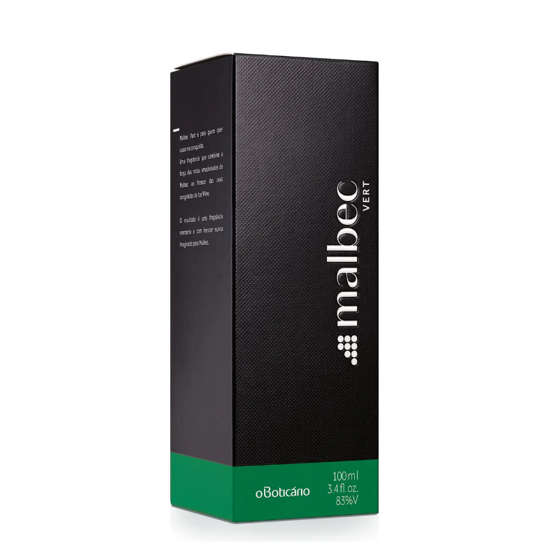 Malbec Vert entrega uma fragrância marcante e refrescante, como nunca imaginada em Malbec. Para desenvolver essa fragrância masculina, o Boticário combinou o álcool vínico, característico do marcante DNA de Malbec, e as uvas congeladas do Ice Wine, trazendo pela primeira vez uma fragrância marcante, porém com um frescor inédito em nossa perfumaria masculina. Essa característica traz uma grande diferenciação para a marca, além da essência marcante da fragrância, delimitada pelo Ice Wine – vinho produzido com uvas congeladas, provenientes de um dos processos mais minuciosos e complexos do mundo da perfumaria. Malbec Vert é um Amadeirado Fresco Aromático único, desenvolvido através de um processo de fabricação exclusivo no mundo, com álcool vínico envelhecido em barris de carvalho francês, que foge do óbvio e consegue ser marcante e refrescante ao mesmo tempo. Nada mais gostoso que desfrutar de uma fragrância que traz toda essa elegância do mundo dos vinhos para sua rotina. Nenhum produto o Boticário é testado em animais, ou seja, este item possui selo Cruelty Free.