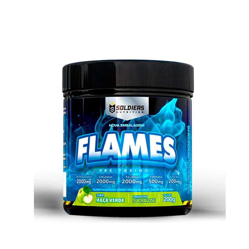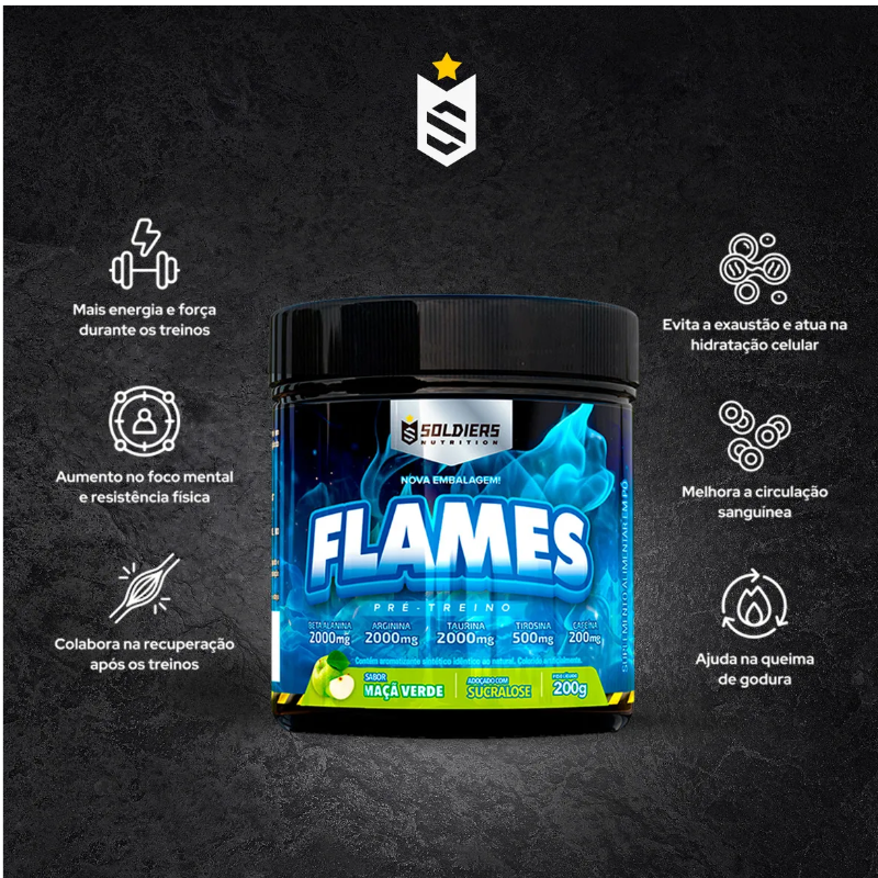 Pré-Treino Flames 200g - Sabor Maçã Verde - Soldiers Nutrition BENEFÍCIOS DO FLAMES: - Aumento de energia e disposição; - Foco nos treinos; - Tira a fadiga; - Aumento de força e concentração nos treinos; - Aumento de resistência física; O pré treino é feito para quem pratica exercícios com muita intensidade e necessita de mais energia para manter o auto nivel de treinamento. Ele auxilia na melhora do desempenho durante a prática dos exercícios físicos, reduzindo o cansaço, a falta de foco e a indisposição. Composto por diversos ingredientes essenciais para manter a energia corporal alta como por exemplo a cafeína e taurina. Além de outros nutrientes que são necessários para a realização de exercícios de alto desempenho e intensos. Aumentando a resistência física e diminuindo a fadiga.