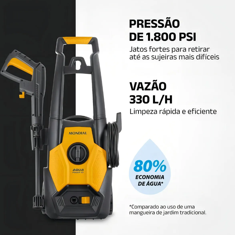 Descubra a alta eficiência da Lavadora de Alta Pressão Aqua Power II da Mondial. Com 1.500W de potência, pressão de 1.800 PSI e vazão de 330 L/h, ela remove até as sujeiras mais desafiadoras de maneira rápida. Perfeita para pisos, carros, bicicletas, quintais e muito mais, ela oferece uma higienização prática e sem complicações. Além disso, a Aqua Power II economiza até 80% de água em comparação com uma mangueira comum, sendo uma escolha inteligente e sustentável. Transforme sua rotina de limpeza e conheça todas as funcionalidades da LAP-02-GY Mondial: Potência de 1.500W: Com motor eficiente e de alta durabilidade, a lavadora de alta pressão Aqua Power II é ideal para uma limpeza rápida e descomplicada. Pressão de 1.800 PSI: Livre-se das sujeiras! Os jatos fortes da LAP-02-GY removem até aquelas mais difíceis. Vazão Máxima 330 L/H: Limpa qualquer área de forma potente com economia de água e tempo.