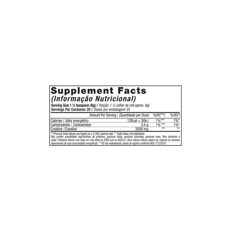 A Creatine Turbo® da linha Caveira Preta Series® da Black Skull USA™ é um suplemento a base de Creatina Monohidratada e Maltodextrina. Onde é comprovado que, a utilização de carboidratos em conjunto com a creatina, promove maior eficácia no efeito da creatina, além do carboidrato agir no aumento de energia, visando apoiar seus resultados nas atividades físicas, oferecendo maior energia e consecutivamente, melhor desempenho. Com seus benefícios, apoia também o ganho de massa e a conclusão dos treinos mantendo a qualidade de suas repetições. Sendo recomendado o consumo de 6g (1 ¼ colher de chá) ao dia. INGREDIENTES: Creatina Monohidratada e maltodextrina. NÃO CONTEM GLÚTEN.