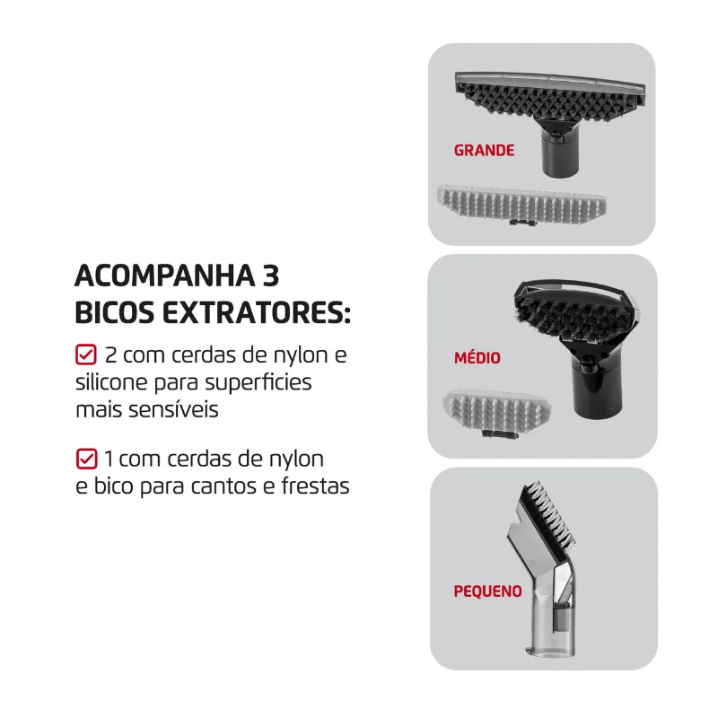 Além disso, a EXP-01-R vem equipada com 3 bicos diferentes para extrair a sujeira de várias superfícies, como estofados, tapetes, sofás, bancos de carro, entre outros.
