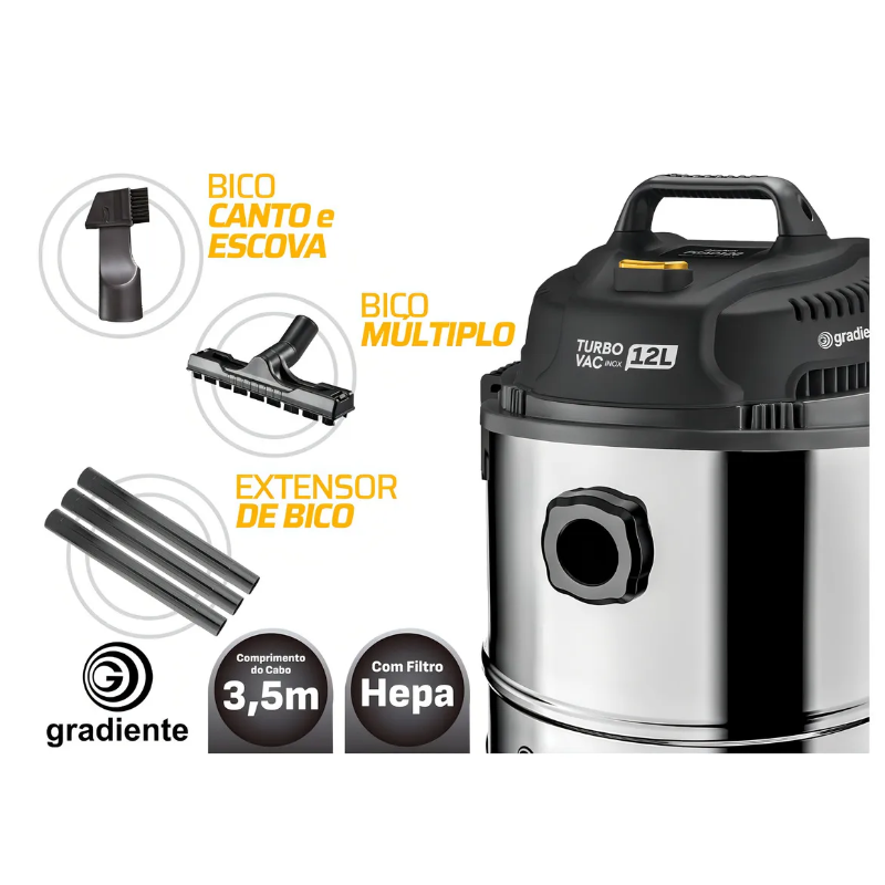 Aspirador De Pó E Água Inox Extratora 12L1200w, Pgac120 Gradiente 220V