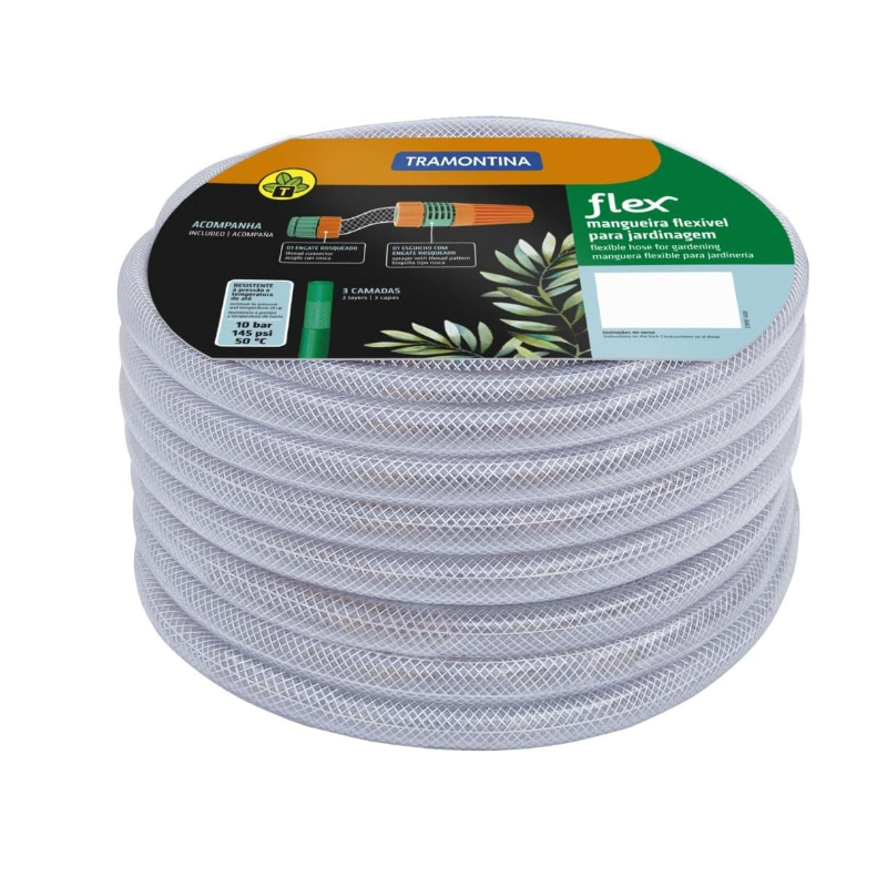 Mangueira Flex para jardim, 15 m, com engates rosqueados e esguicho.Cuidar do jardim tem que ser uma atividade prazerosa.Por isso, nada como ter uma mangueira totalmente adequada e resistente. A mangueira Flex da Tramontina agrega eficiência e qualidade ao seu trabalho e facilita a sua vida no dia a dia.Produzida com material resistente de alta flexibilidade, a mangueira possibilitará atingir os pontos mais difíceis na hora de irrigar o seu jardim.