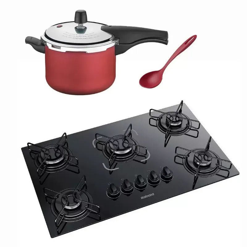 Cooktop Itatiaia Essencial 5 Bocas Mesa Vidro Preto Bivolt e Panela De Pressão Vancouver 4,5 Litros Vermelha com Concha