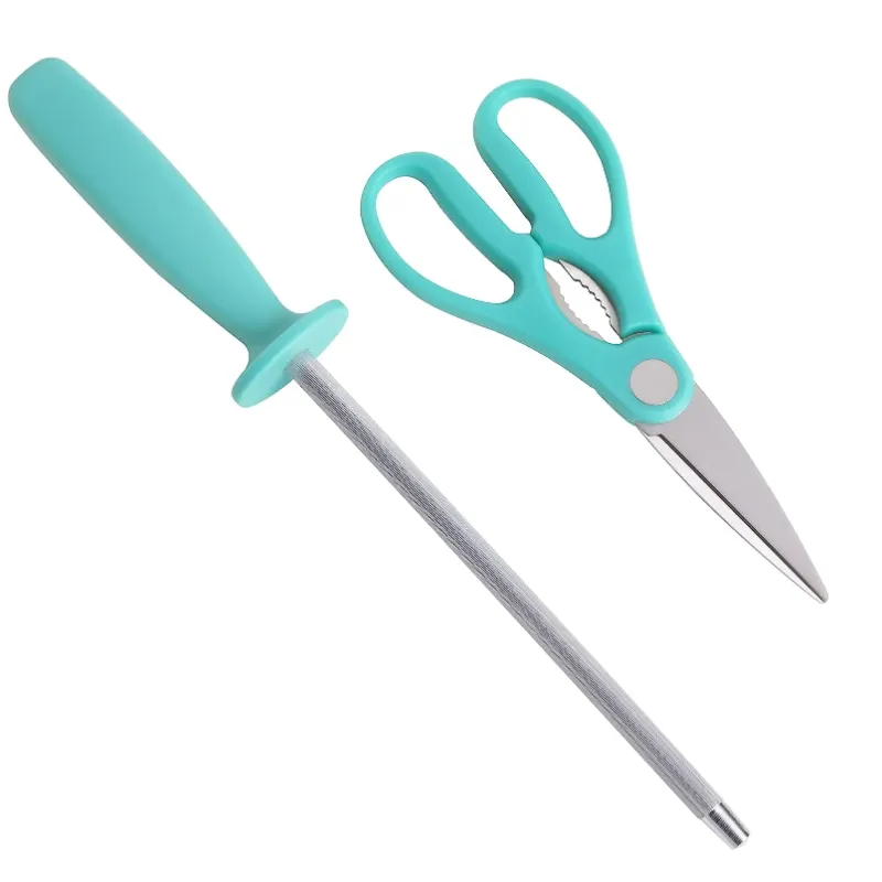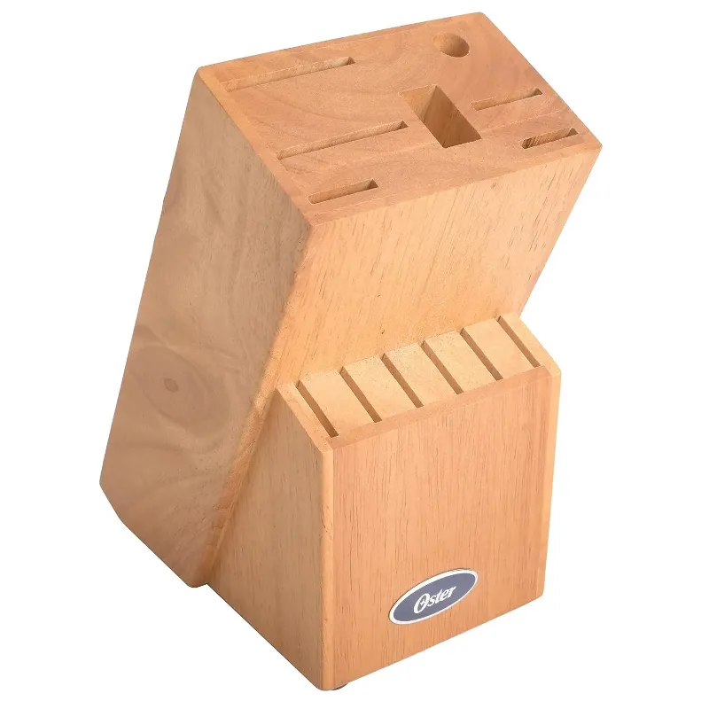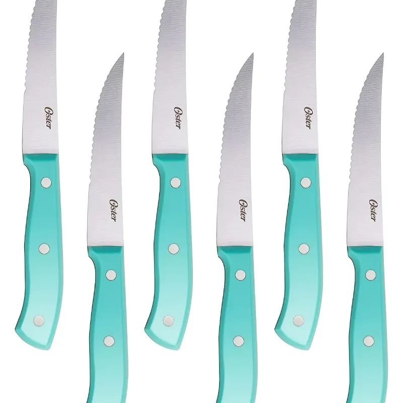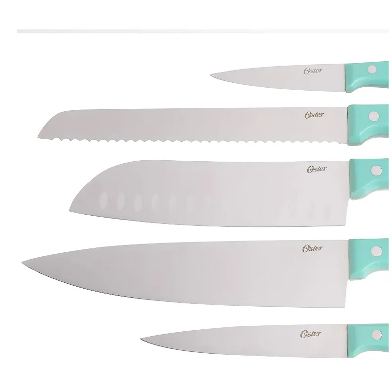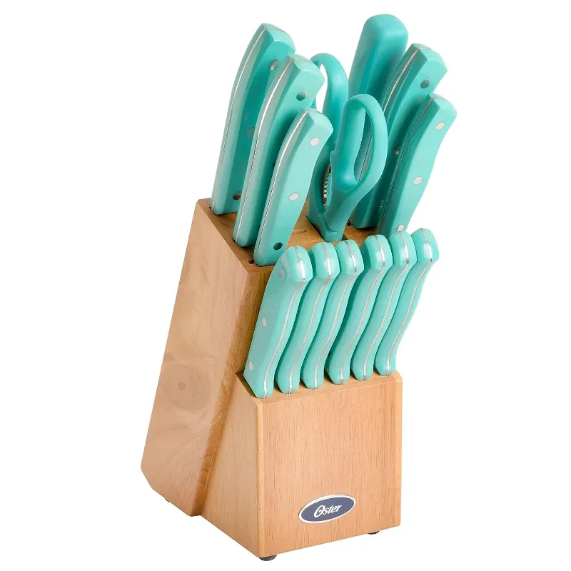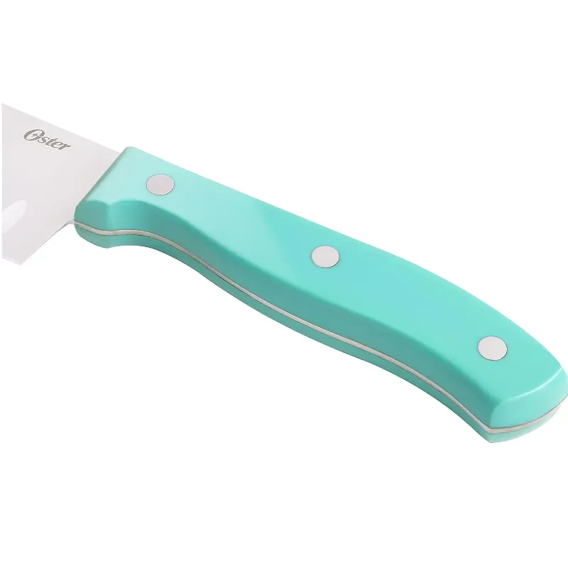 Certifique-se de que todas as suas necessidades de fatiar e cortar em cubos sejam atendidas com o abrangente conjunto de talheres Oster Evansville de 14 peças. Cada peça desta coleção oferece precisão e durabilidade, e seu visual elegante é complementado por um belo acabamento em aço inoxidável. Tem lâminas de aço inoxidável resistentes a manchas e ferrugem e alças na cor turquesa para equilíbrio. Todas as peças são armazenadas em um prático bloco de madeira preta, adicionando elegância à sua bancada. Alças ergonomicamente projetadas para conforto durante o corte. Uso recomendado: residencial