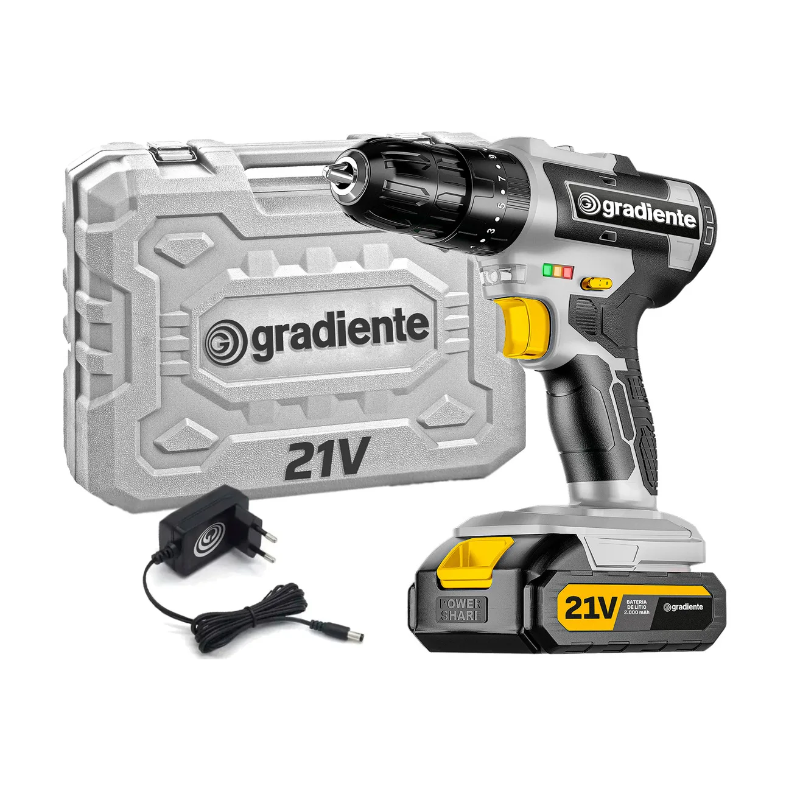 FURADEIRA PARAFUSADEIRA DE IMPACTO SEM FIO A BATERIA 21V 3/8 10MM GPB21VW COM MALETA E ACESSÓRIOS 1 BATERIA - Gradiente A furadeira Gradiente GPB21VW a bateria de 21V é uma ferramenta poderosa e versátil projetada para atender às necessidades de perfuração em diversos materiais; Com um design ergonômico e compacto, proporciona conforto durante o uso prolongado e facilita o manuseio em espaços restritos.