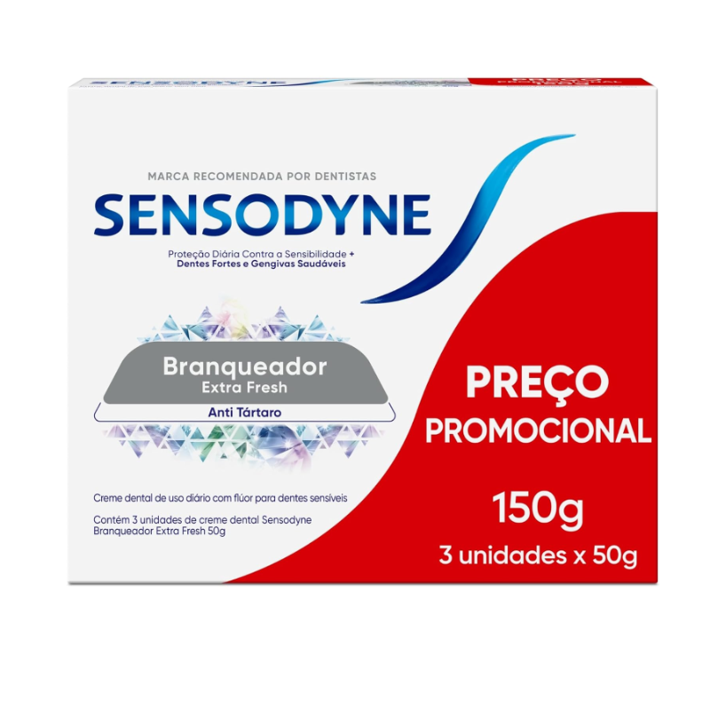 Descubra o poder do Sensodyne Creme Dental Branqueador Extra Fresh com Flúor, especialmente formulado para proteção diária contra a sensibilidade enquanto ajuda no clareamento dental. Este creme dental é ideal para quem busca alívio eficaz e duradouro da sensibilidade dentinária. Com ingredientes de alta qualidade, a pasta de dente Sensodyne ajuda a remover manchas, trazendo um sorriso mais branco e saudável. Além disso, previne cáries graças ao flúor presente em sua composição. Sua fórmula avançada também trabalha na saúde das gengivas e a remoção da placa. A sensação de frescor prolongada é um bônus adicional, fazendo de cada escovação uma experiência revigorante. Para obter os melhores resultados, escove os dentes duas vezes ao dia. Creme Dental Sensodyne Branqueador Extra Fresh é a escolha perfeita para quem deseja uma pasta de dente que combina clareamento dental com cuidado superior para dentes sensíveis. Combine a pasta de dentes com a escova dental Sensodyne correta para um cuidado diário eficaz.