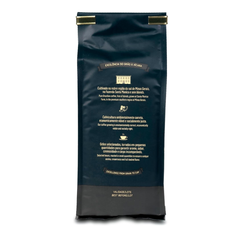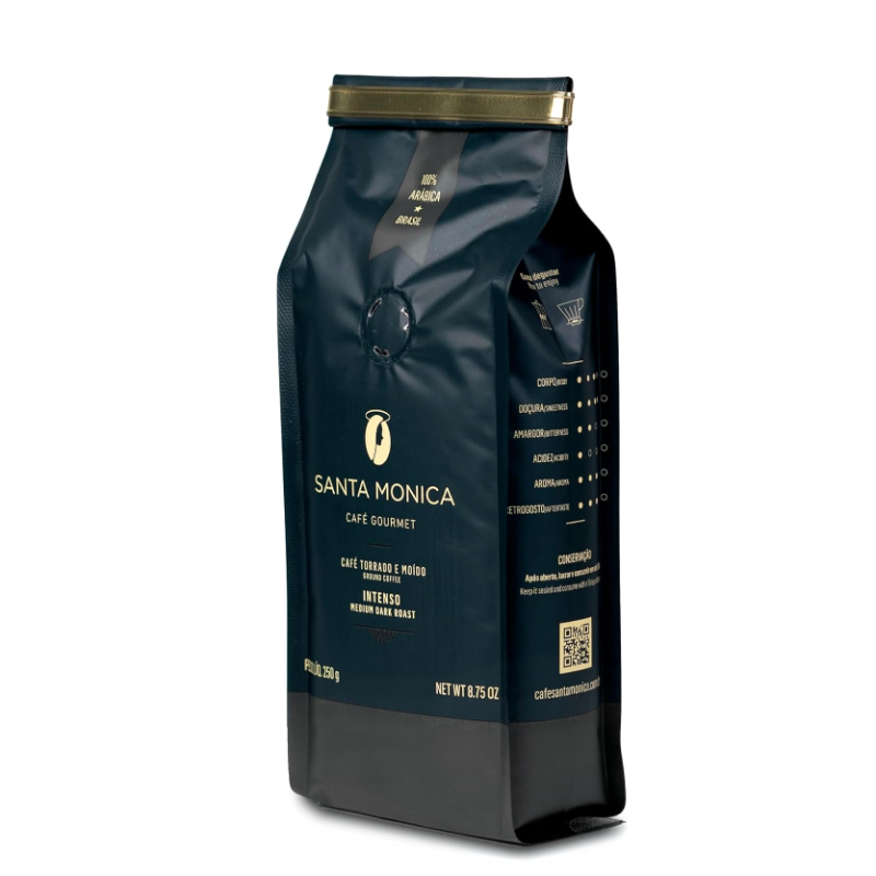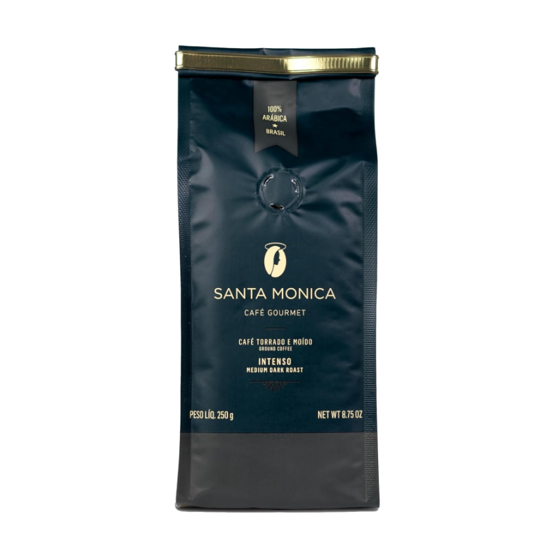 Café Gourmet Santa Monica, Moído Intenso é um café encorpado de torra acentuada, com retrogosto prolongado e notas achocolatadas. Um produto que apresenta doçura natural e cremosidade intensa. O café gourmet para se degustar nos métodos filtrados, já moído em pacotes de 250 g com válvula desgaseificadora, e tin-tai