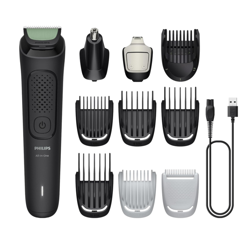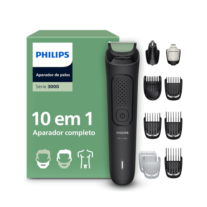 O Multigroom Philips MG3931/15 foi desenvolvido para durar: suas lâminas em aço inoxidável protegem a pele contra irritações, são auto afiáveis e não precisam ser lubrificadas, mesmo após anos de uso. Inclui 10 acessórios. Experimente um novo visual em qualquer dia da semana com o durável aparador de pelos multifuncional Philips Multigroom 3000 para homens. Com 10 acessórios, lâminas de aço autoafiáveis para precisão duradoura e pontas arredondadas para um corte mais suave, este barbeador elétrico versátil e eficiente para homens atende eficientemente a todas as suas necessidades de higiene. É um aparador de cabelo e barba em que os homens sempre podem confiar! Apare e modele sem esforço sua barba e cabelo com lâminas de precisão e pentes para barba que proporcionam linhas retas e limpas para a aparência desejada. Use o pente aparador de cabelo com várias configurações de comprimento para manter seu penteado em casa. O pente corporal de encaixe garante um corte suave e eficaz para uma limpeza confortável. Além disso, remova facilmente os pelos indesejados do nariz e das orelhas sem cortes ou cortes com o acessório aparador de pelos do nariz. Obtenha um corte preciso e uniforme com lâminas de aço autoafiáveis que proporcionam resistência adicional para máxima precisão à medida que você apara, mantendo-se tão afiada quanto no dia 1 sem a necessidade de óleo da lâmina. O nosso pente de precisão, com regulações de comprimento em passos de 0,5 mm de 1 a 3 mm, proporciona um corte uniforme no comprimento exato que pretende para um acabamento ideal. Experimente uma aparência suave e confortável com a tecnologia de lâmina exclusiva com pontas arredondadas para um toque mais suave em sua pele. O pente íntimo do aparador All-in-One protege as áreas sensíveis durante o corte, garantindo uma suavidade extra. A empunhadura ergonômica permite fácil manuseio e manobrabilidade, proporcionando o conforto e o controle necessários para alcançar sua aparência ideal. Barbeador elétrico Construído para durar, a bateria durável oferece até 70 minutos de autonomia para um corte ininterrupto. O indicador luminoso mostra o status de carregamento da bateria. Com o carregamento USB-A, é fácil ligar em qualquer lugar (o adaptador não está incluído). Os acessórios resistem à flexão e as cabeças removíveis são enxaguadas para manutenção rápida. Conteúdo da caixa 1x aparador multifuncional Philips série 3000, 1x lâmina de conforto, 1x aparador de nariz, 1x pente ajustável (1-3 mm), 1x pente para barba (5 mm), 3x pentes de cabelo (9 mm, 12 mm, 16 mm), 1x aparador de detalhes, 1 pente corporal (3 mm), 1 pente íntimo (1 mm), 1 bolsa de armazenamento simples, 1 escova de limpeza, 1 cabo de carregamento USB-A; adaptador de energia não incluído