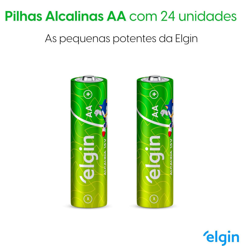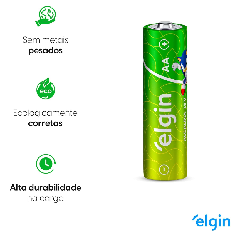 Indicadas para equipamentos que requerem descargas de energia rápidas e fortes como brinquedos, câmeras fotográficas digitais, MP3 players, lanternasColaboram para a preservação do meio ambiente, pois não apresentam metais pesados em sua composição com 0% de Cádmio e MercúrioAs pilhas Elgin Energy são testadas periodicamente por laboratórios credenciados pelo INMETROQualidade e conformidade com a resolução Conama 401Pilha turbio AA com 24 pilhas