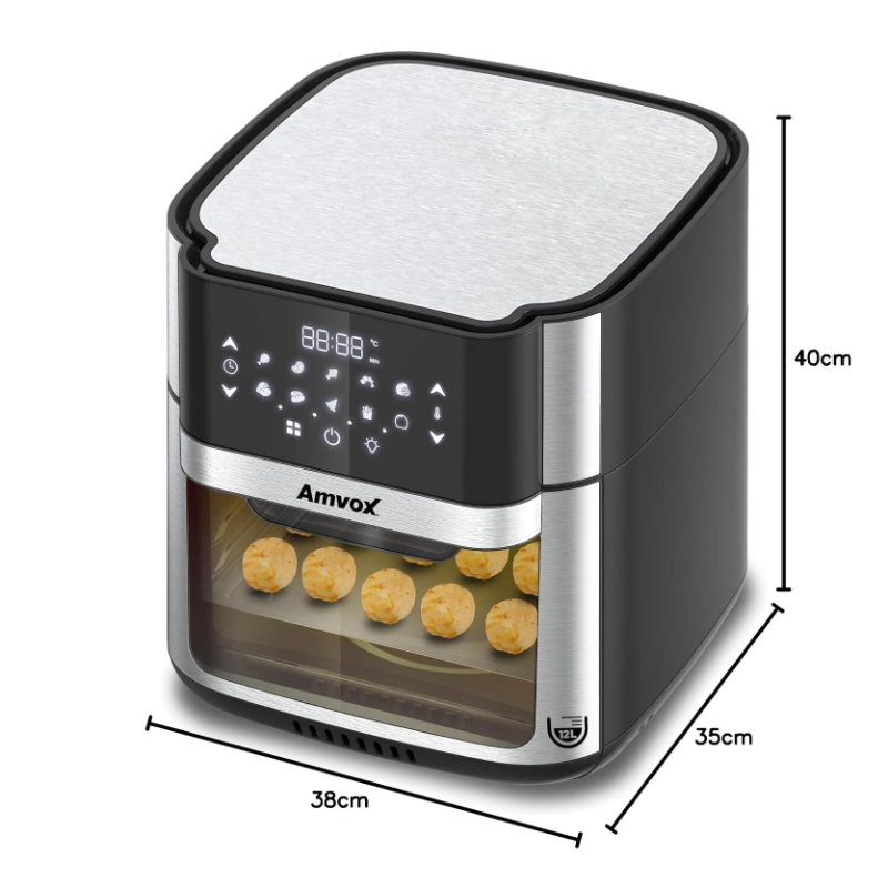 A Air Fryer Amvox ARF 1412 Oven tem capacidade de 12 litros, campainha de prontidão automática, circulação rápida de ar, 10 menus predefinidos de receitas, visor led com tela sensível ao toque, proteção contra superaquecimento, 1700W potência, pés antiderrapantes, 1 bandeja para assar, 1 basket para fritar, função fritadeira, grelha, desidratação e forno
