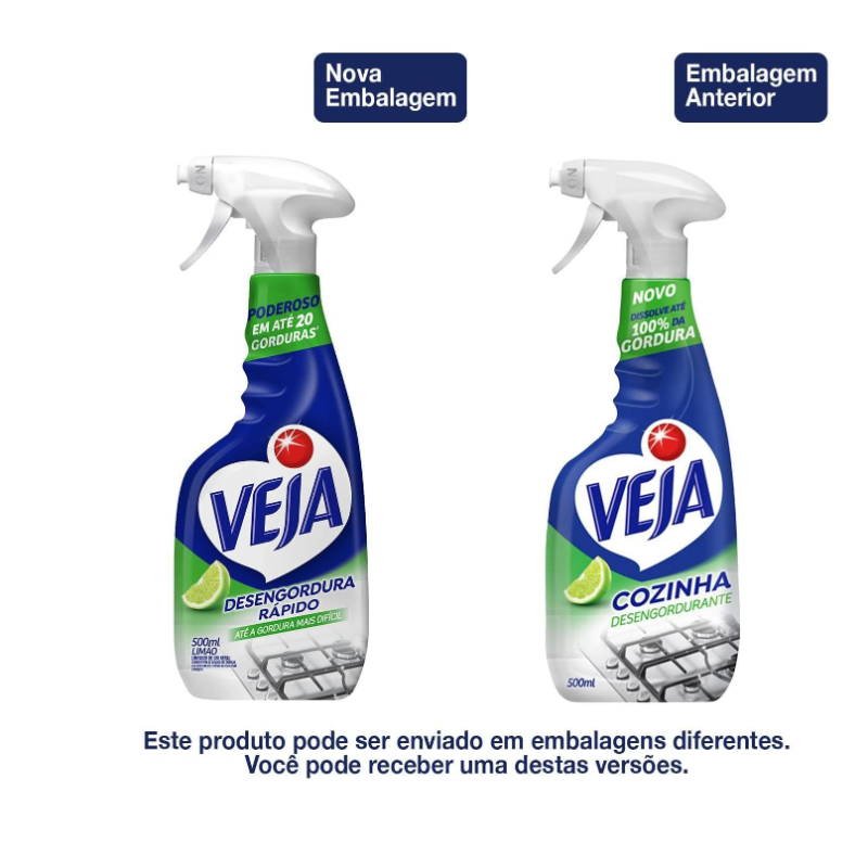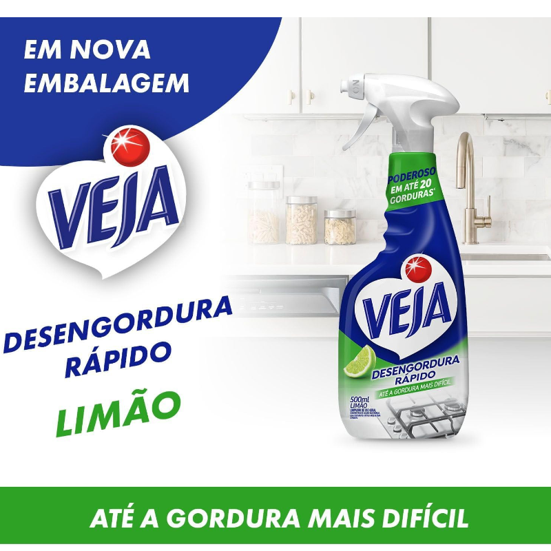 Veja Desengordura Rápido é um limpador de superfícies que dissolve rapidamente até 100% da gordura, rende até 20x mais que detergente¹ e restaura o brilho², sem esfrega, esfrega, deixando uma fragrância agradável. É um produto de limpeza que elimina até 20 tipos de gorduras³, até as mais difíceis e pode ser utilizado em diversas superfícies, em box e louças4. Precisa de um desengordurante poderoso? Veja Desengordura Rápido é a solução completa de limpeza para sua casa. Sua fórmula exclusiva com poderosa ação desengordurante pode ser usada em diversos cômodos, pisos, utensílios e superfícies em geral5. Prático e fácil de usar! Para a limpeza diária, aplique o produto nas superfícies a serem limpas e, em seguida, passe um pano ou esponja macia. Para sujeiras mais difíceis, deixe o produto agir por alguns instantes. Para superfícies verticais, recomenda-se aplicar o produto diretamente no pano. Veja Desengordura Rápido deixa a sua casa com a cara da limpeza. Curtindo a casa? Preparar refeições deliciosas para a família e receber amigos é algo muito prazeroso e Veja Desengordura Rápido torna estes momentos ainda mais especiais. Ele pode ser usado em diferentes ambientes da casa, garantindo limpeza prática, remoção rápida de gorduras e sujeiras e uma fragrância fresca. Aproveite cada momento e deixe que Veja cuide da limpeza. Viva sua casa. Veja depois. Eficiência e Praticidade Veja é a marca brasileira presente há mais de 50 anos na casa dos consumidores, n°1 em produtos de limpeza6 e a mais escolhida pelos brasileiros6. Com o slogan “Viva sua casa. Veja depois”, convida a todos a não deixarem que o medo da sujeira os impeça de viver a sua casa ao máximo e que a limpeza, com o auxílio de Veja, abra espaço para que novas experiências e histórias sejam criadas dentro de casa com aqueles que mais amamos. Descubra o poder de Veja Desengordura Rápido, disponível nas fragrâncias: Limão, Laranja e Lavanda. ¹Considerando limpeza de gorduras queimadas/testado versus os principais detergentes do mercado (não concentrados) da categoria de lava-louças. Consulte a diferença de preços entre os produtos. 2Brilho proveniente da limpeza da superfície. ³Gorduras e condições testadas. Confira a lista de gorduras no site oficial. 4Para o uso em utensílios de cozinha, siga o modo de uso e, em seguida, lave com bastante água corrente e prossiga com a lavagem como de costume. 5Teste o produto em uma pequena superfície antes de usar. 6 Tipo do serviço de medição (RETAIL INDEX EVOLUTION) / Período: YTD’24 – (JAN’24 ATÉ JUN’24) / Abrangência geográfica (Total Brasil) / Mercado: CP 102 – DESINFETANTES – MARCA / Canais reportados: TOTAL BRASIL INA + C&C Leia atentamente o rótulo antes de usar.