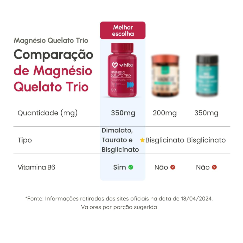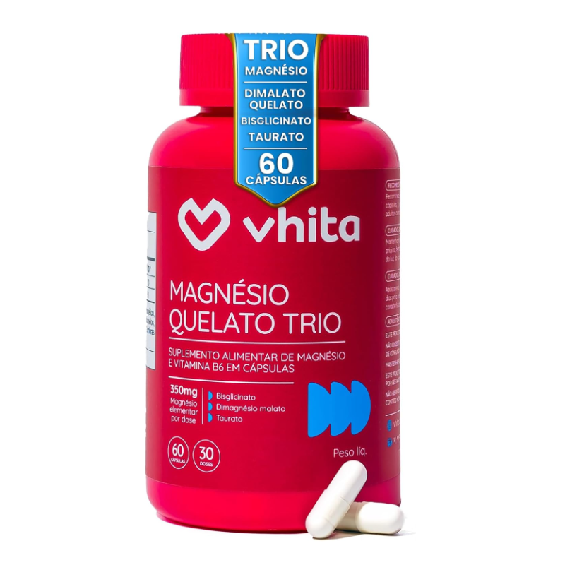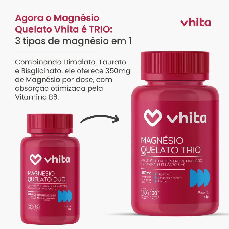 Vhita Magnesio Quelato Trio, Dimalato, Bisglicinato e Taurato, com Vitamina B6, 60 Cápsulas