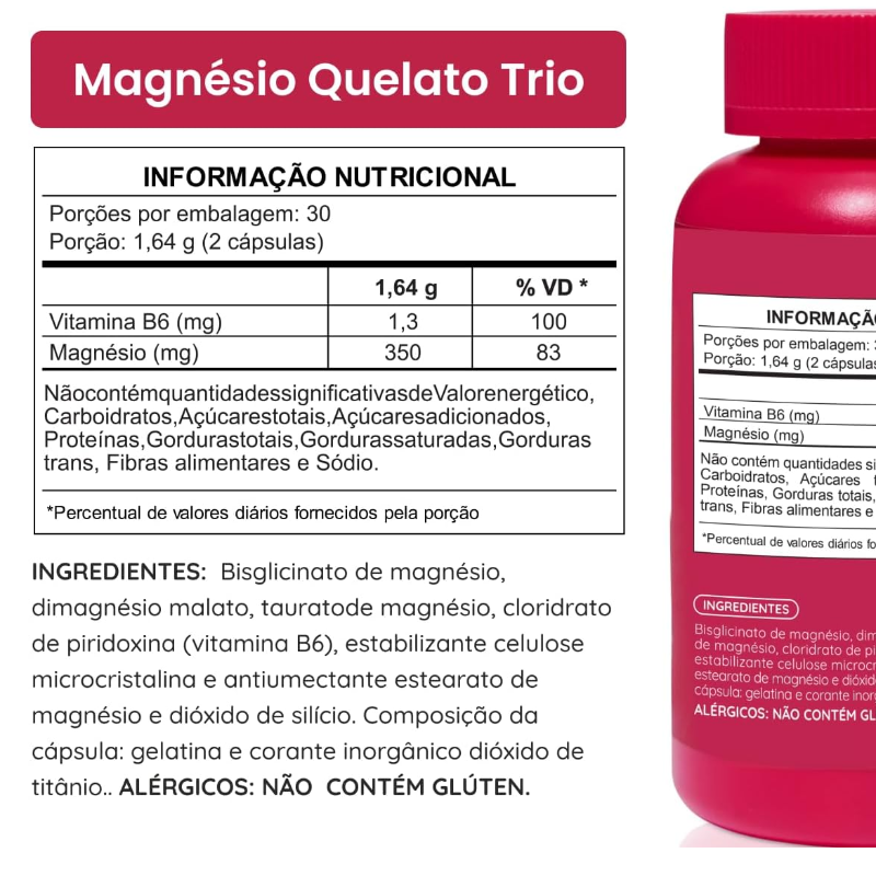 Bisglicinato de magnésio, Dimalato de magnésio, Cloridrato de piridoxina (vitamina B6). Antiumectante: Dióxido de silício. Lubrificante: Estearato de magnésio. Estabilizante: Celulose microcristalina. Cápsula: Gelatina, Corante inorgânico dióxido de titânio e Água.