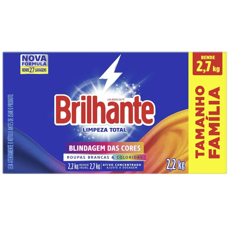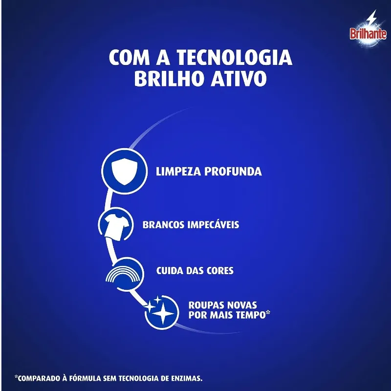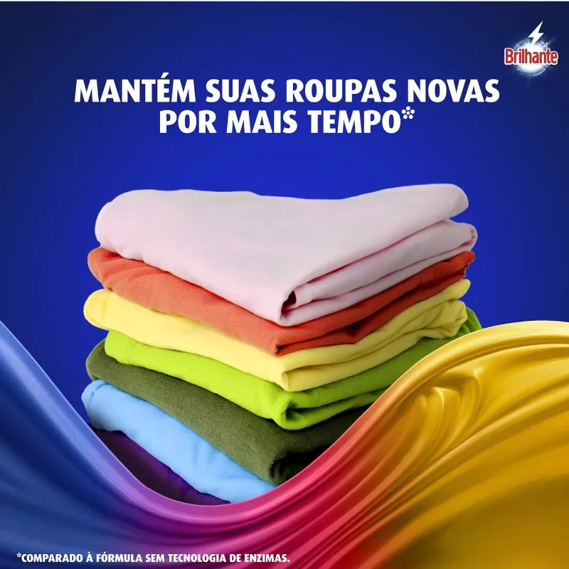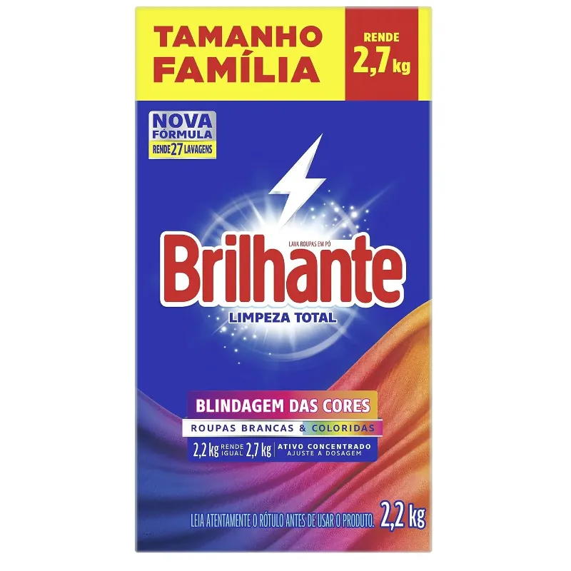 A nova fórmula do Sabão em Pó Brilhante Limpeza Total combina os melhores resultados de limpeza com o cuidado dos tecidos: de um lado, o poder das enzimas, que proporciona uma limpeza profunda ao mesmo tempo que evita que a sujeira volte a se depositar nas roupas; do outro, a tecnologia Brilho Ativo que evita o amarelamento das roupas brancas e mantém os coloridos mais vivos. O Lava-Roupas em Pó Brilhante Limpeza Total limpa profundamente suas roupas sem agredir os tecidos, ajudando a prevenir os sinais de desgaste das suas peças preferidas após cada lavagem, além de permitir a blindagem das cores, deixando-as muito mais vivas e impactantes. Entre limpeza profunda e blindagem da cor? Escolha os dois! Com Brilhante, você sempre leva mais com a solução completa! Brilhante limpa as suas roupas brancas e coloridas enquanto cuida das cores. É um ativo concentrado poderoso. Brilhante quer se tornar um aliado nas tarefas diárias de seus consumidores e busca trazer praticidade com produtos inovadores e que todo mundo possa usar, diminuindo o peso das tarefas e liberando tempo para as demais atividades do dia a dia. Acesse o nosso website para saber mais. *Comparado à fórmula sem tecnologia de enzimas.