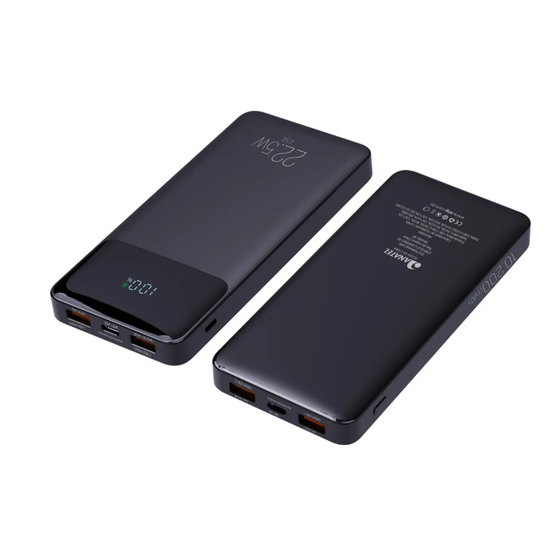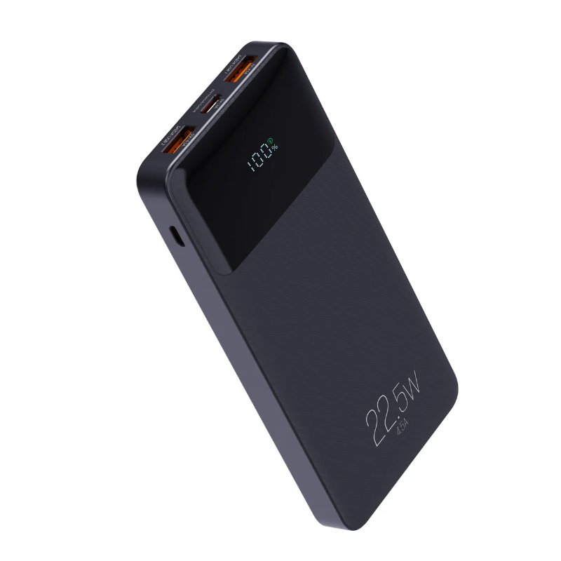 O dispositivo conta com múltiplas entradas (Micro USB e USB-C) e duas saídas USB-A, permitindo carregar diferentes aparelhos simultaneamente. Seu sistema de carga rápida com tecnologia PD 20W e QC 3.0 22.5W proporciona recarga eficiente dos seus dispositivos, além de incluir proteção contra aquecimento, curto-circuito e sobrecarga.