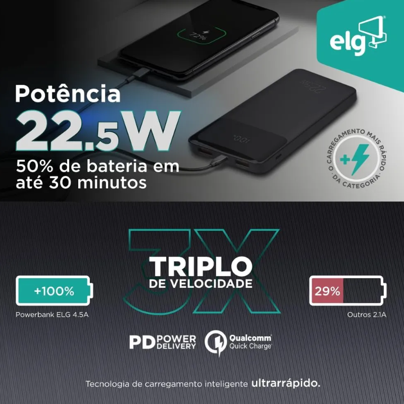 Seja para viagens, atividades ao ar livre ou uso diário, o Power Bank ELG PB102BK de 10.200mAh oferece uma boa combinação de capacidade, funcionalidade e praticidade. Com display digital indicador de carga e tecnologia de carregamento rápido, ele se adapta bem às necessidades de smartphones, tablets e outros dispositivos USB. Desenvolvido para usuários que precisam de energia extra em qualquer lugar, este power bank atende às necessidades de quem procura autonomia com controle visual da carga.